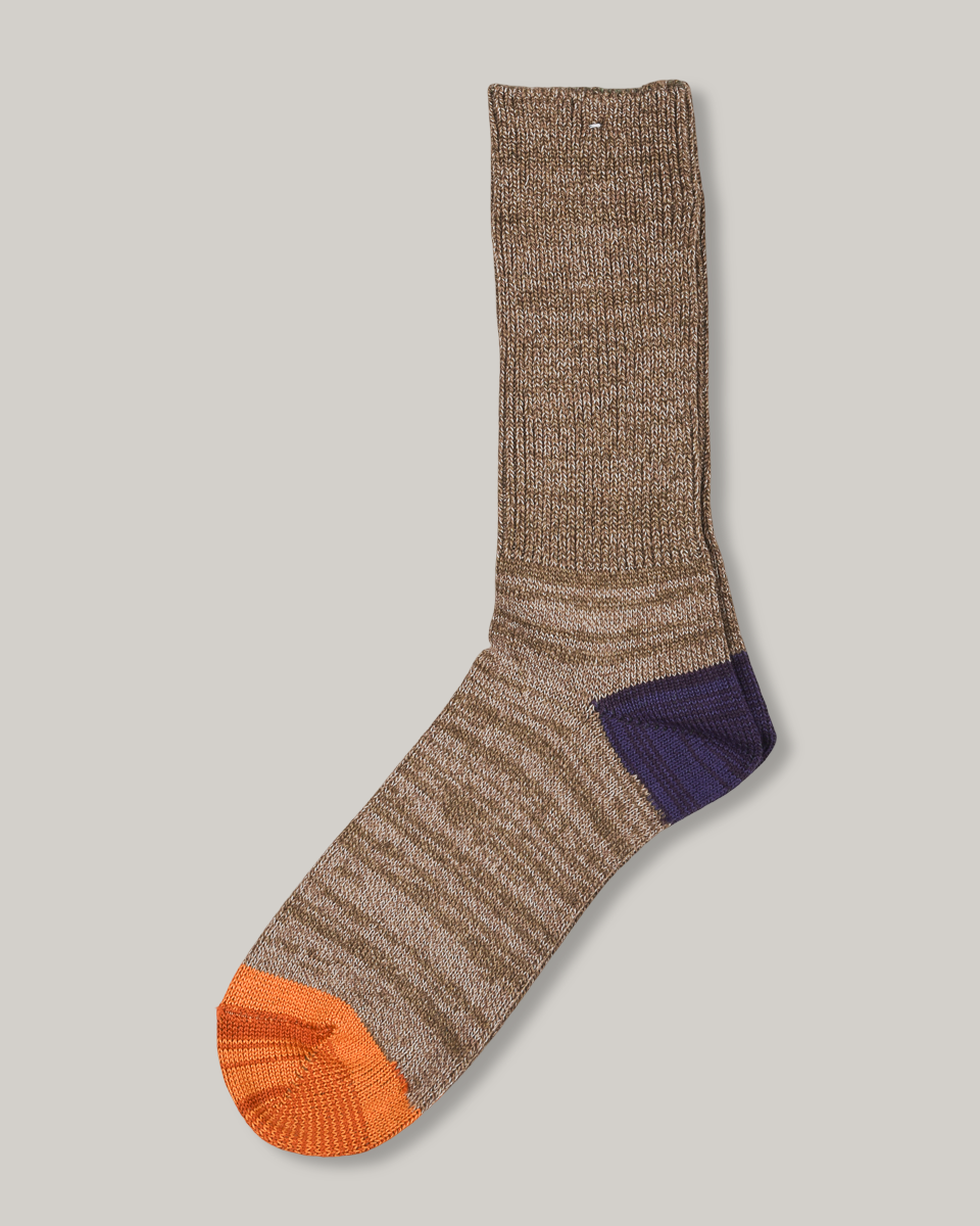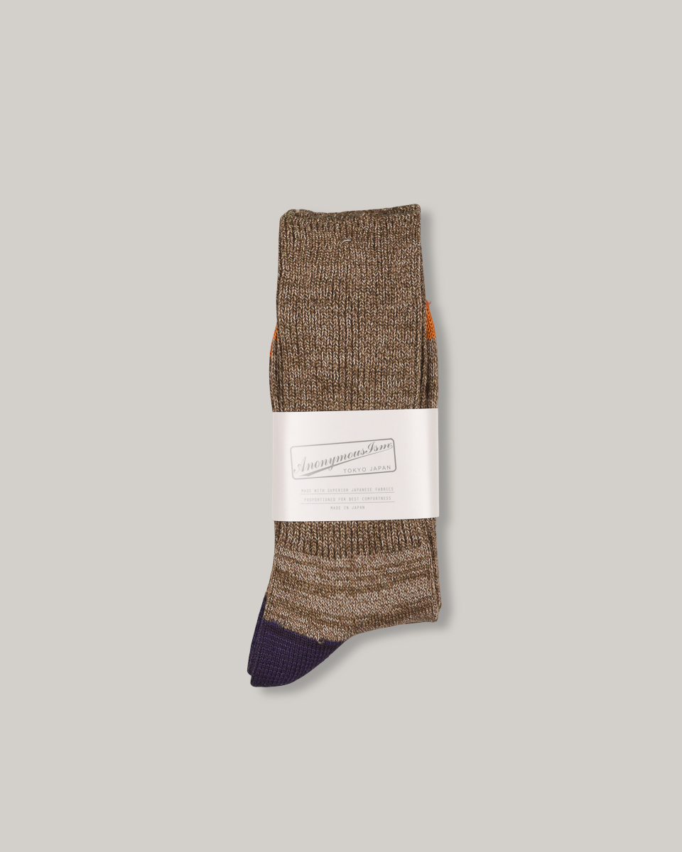 Fine-gauge cotton crew from Anonymous Ism with contrast heel and toe - purple at the heel, orange up front. Easy everyday wear with just enough going on.