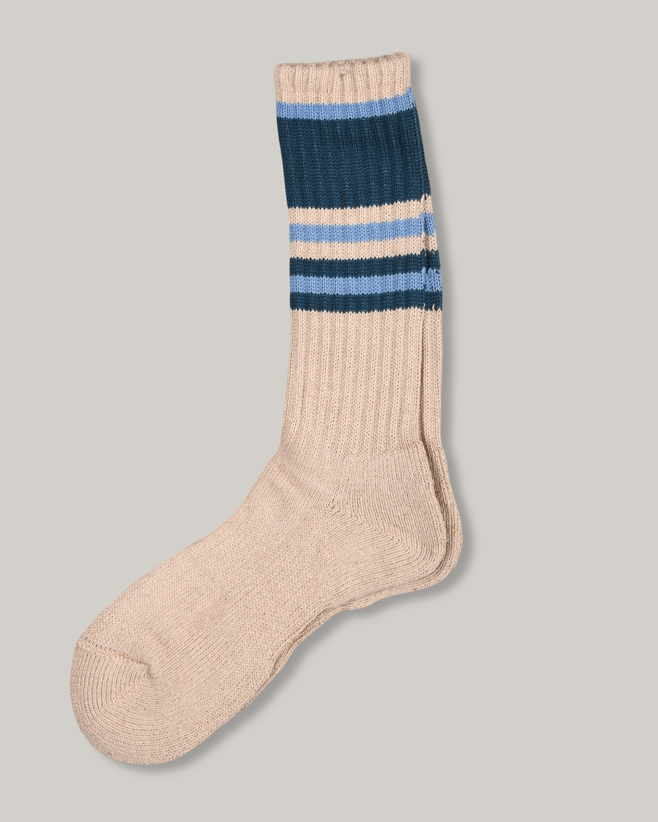 A thick, luscious sports sock in natural coloured cotton and hemp, with differing stripes of blue and teal to tantalise your toes.