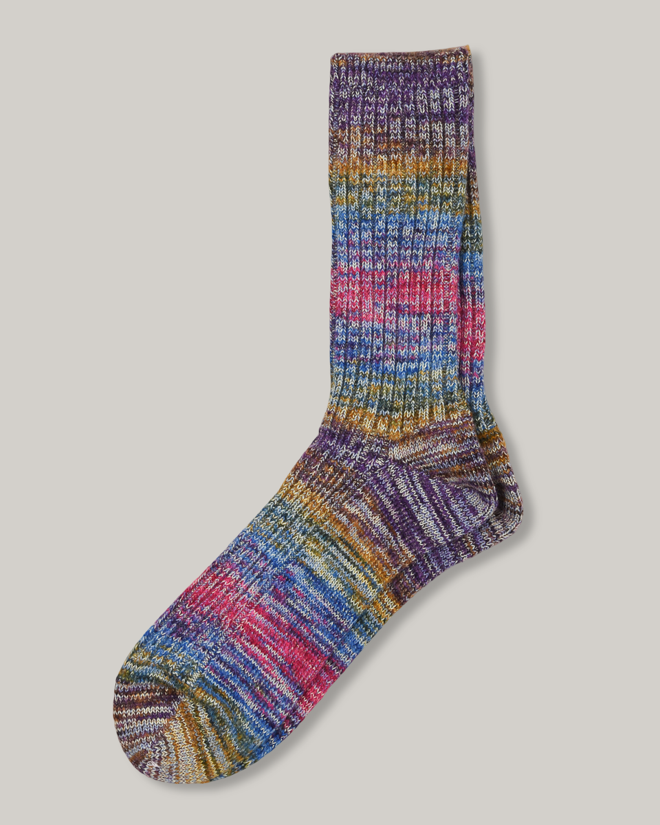 Seasonal staple from Anonymous Ism - splash-dyed crew with a one-off feel. Combed cotton brings out the colour, and the kasuri-dyed yarn keeps every pair looking a little different.
