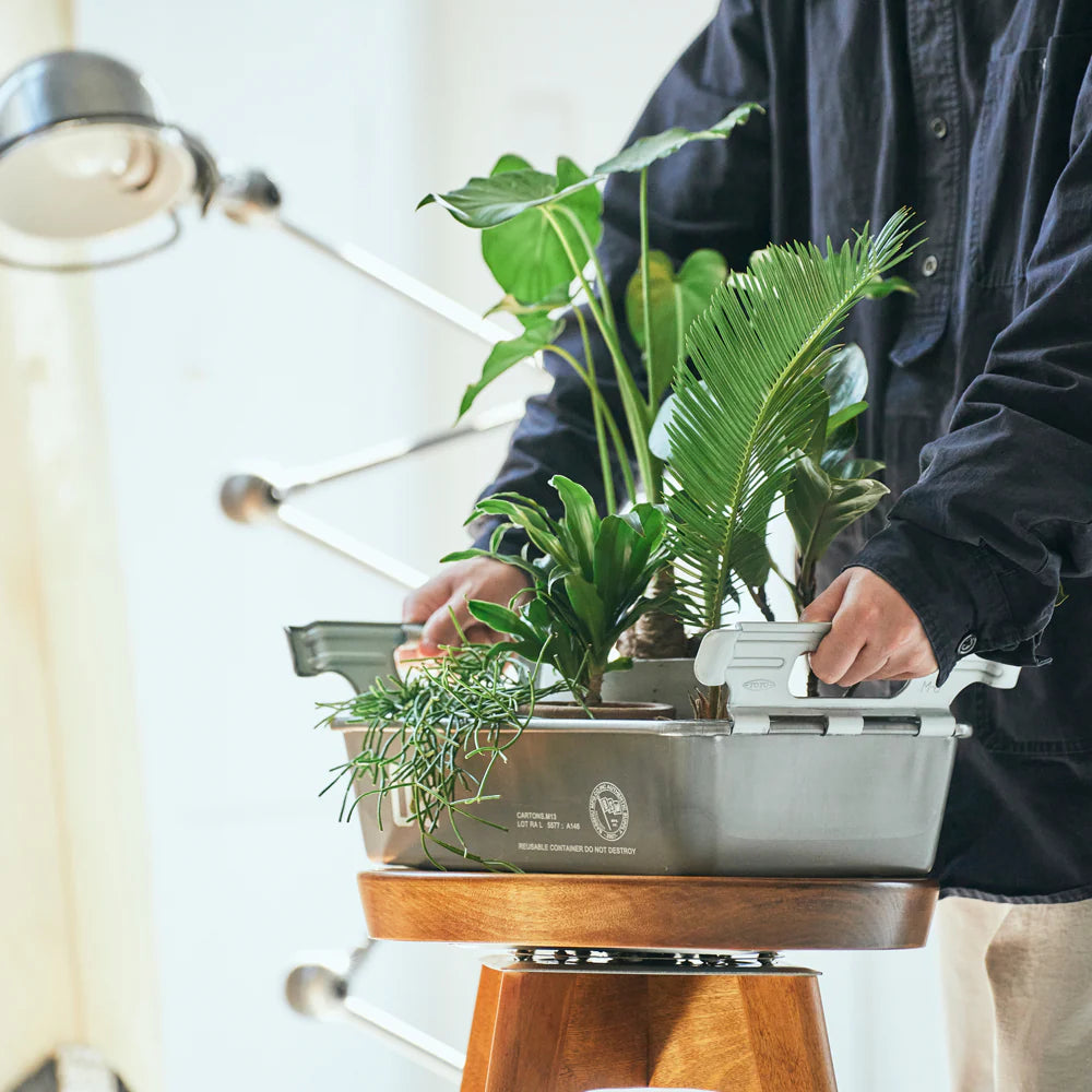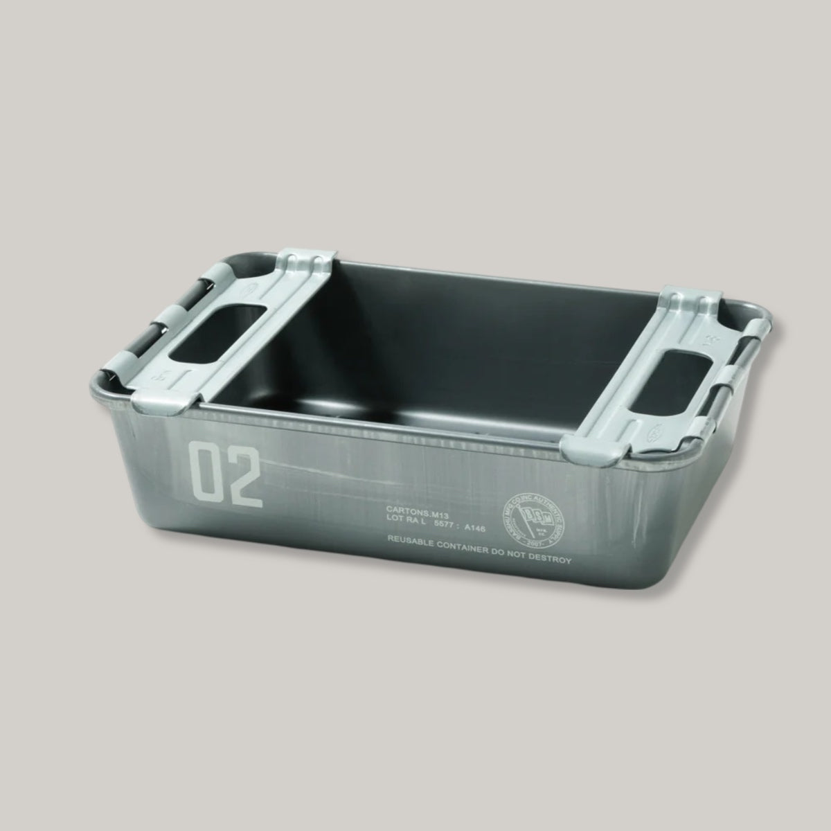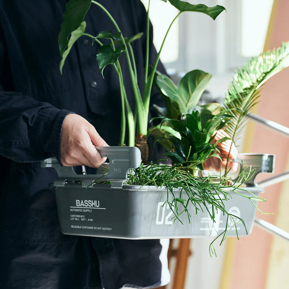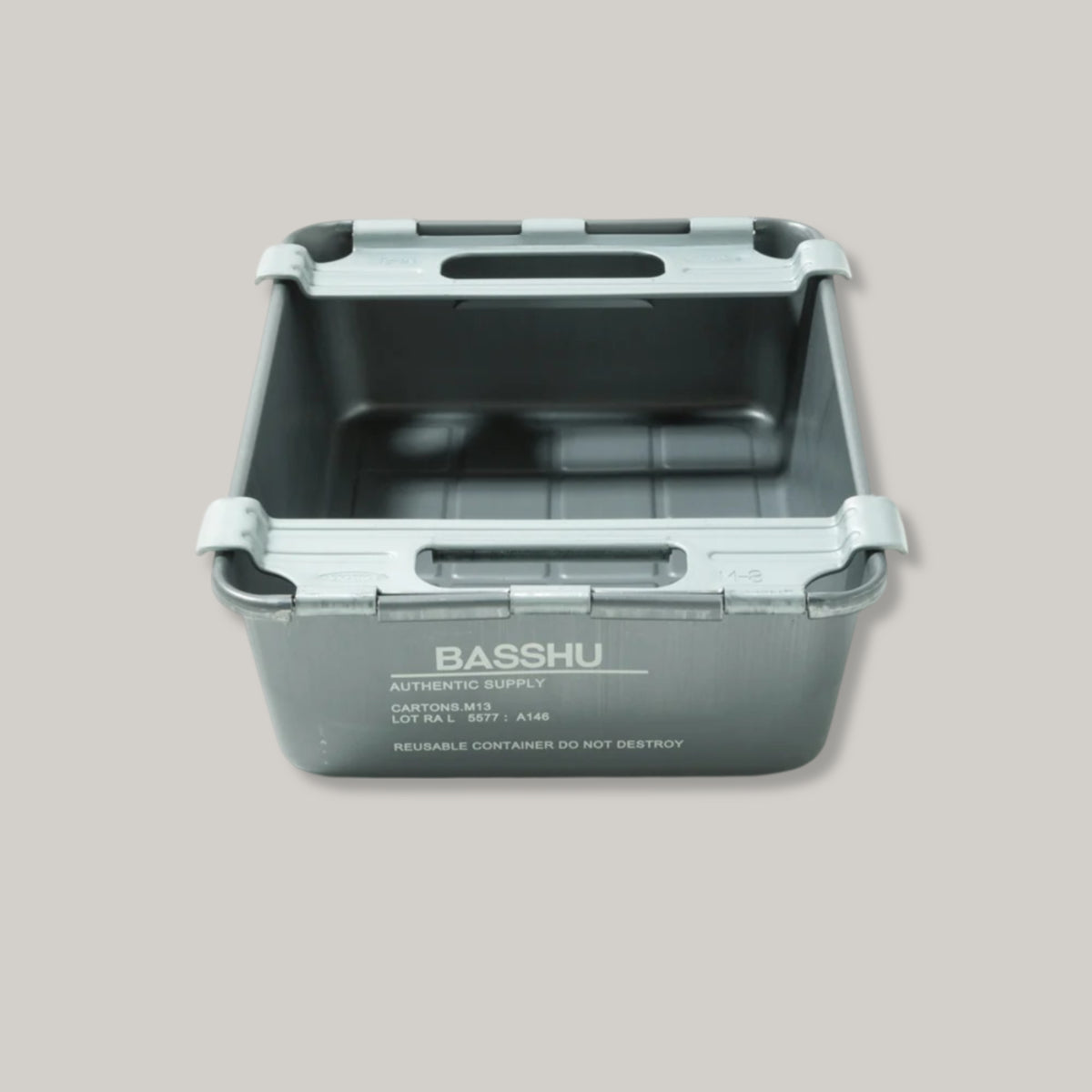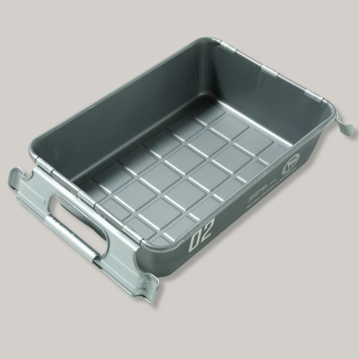 Made for Basshu by Toyo, the first company to build a seamless tool box from steel plate. This is then galvanised so is rust-resistant and as there are no seams or holes, there is no part of it which can leak. With two carrying handles for easy mobility. Utilising the well established M8 model, it has been stamped on the side to denote the collaboration.