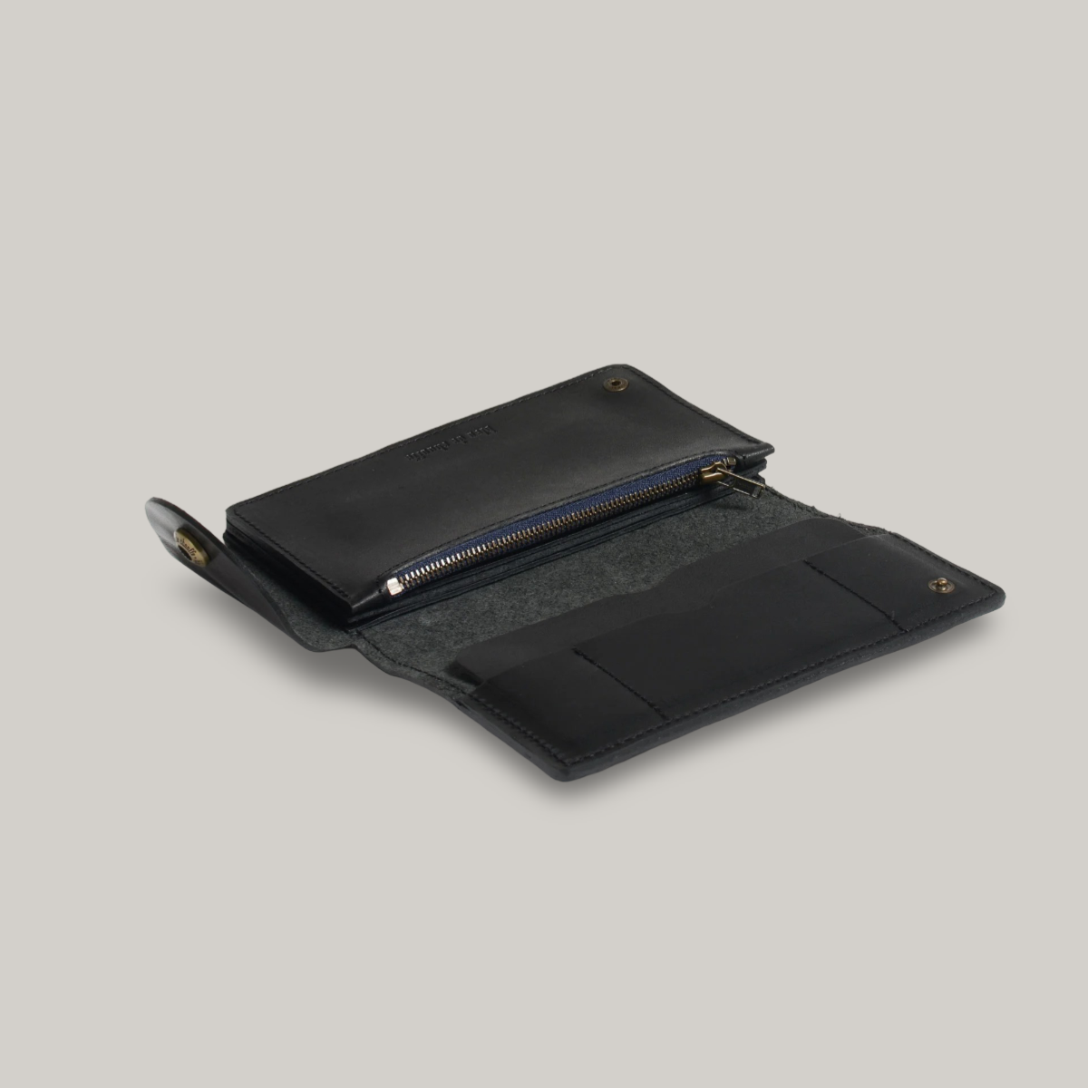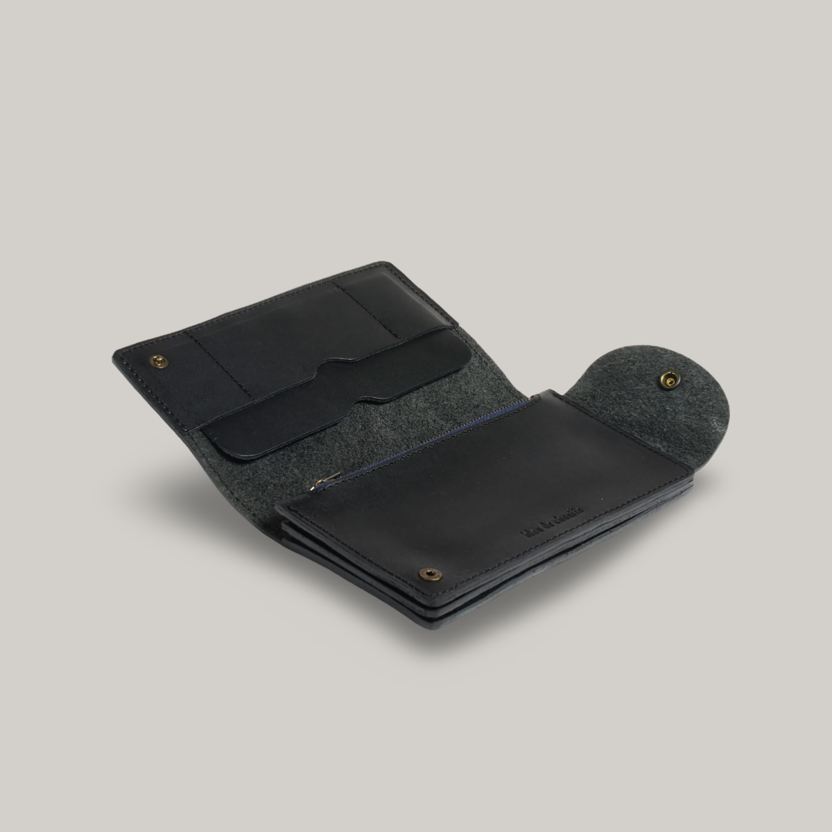 Using the Grisbi as its basis, this wallet has a number of pockets and inserts for cards, ID's and a large zipped section for coins, receipts and other sundries. The whole piece is made in an aged black leather, creating a wave-like pattern on the surface, with a press stud fastening on both the base and the flapped top.