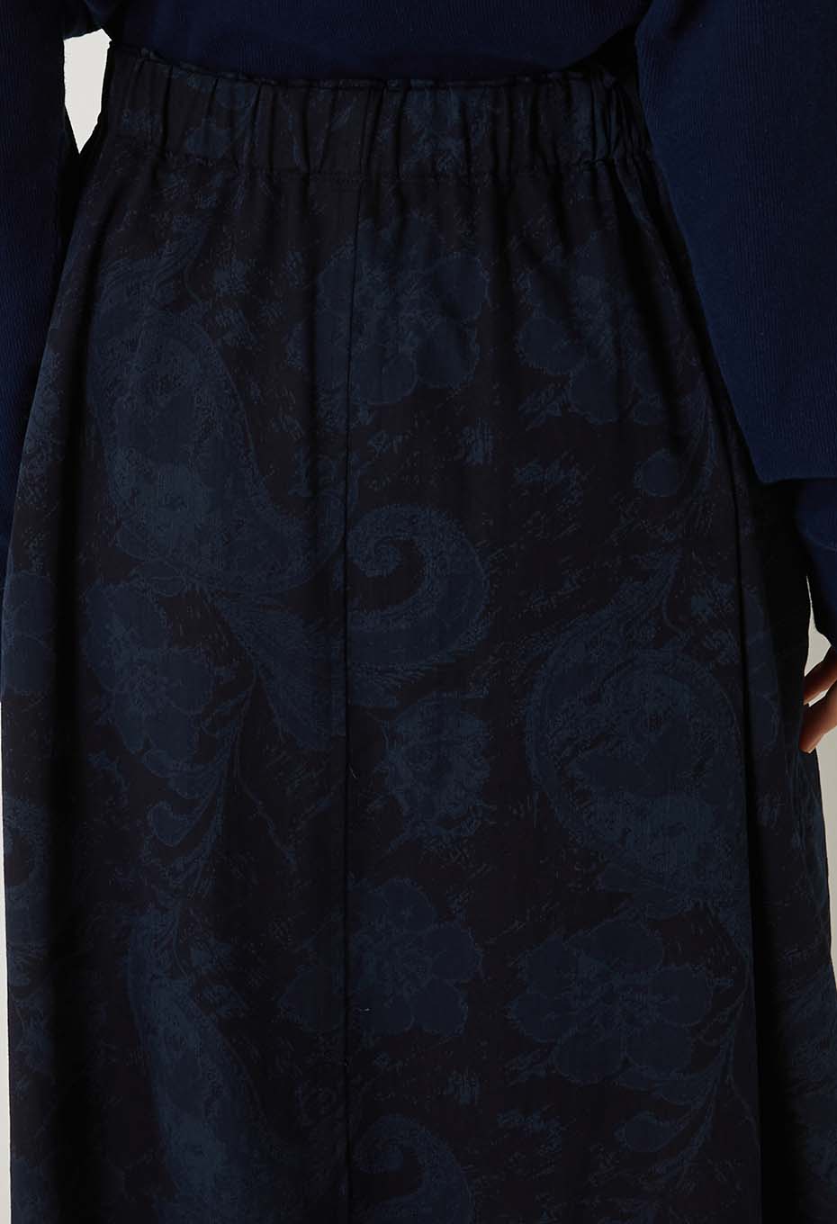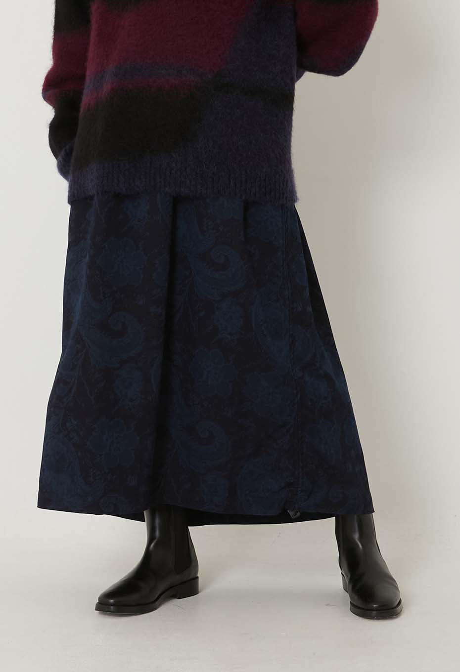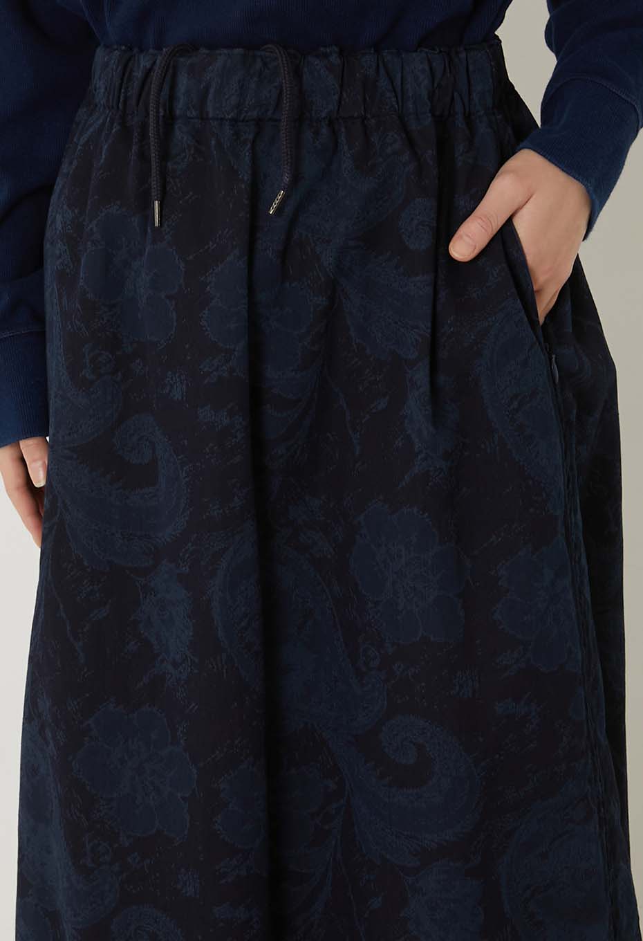 Inspired by the season's theme, "Tsujigahana," the pattern is created using bleach. bleach, which creates gradation of colour intensity, creates a depth reminiscent of an antique-style pattern. The drawstring elastic on the side line allows you to adjust the hemline, adding variety to your look. This is a simple yet striking gathered skirt that makes the most of the texture Material and the bold pattern.