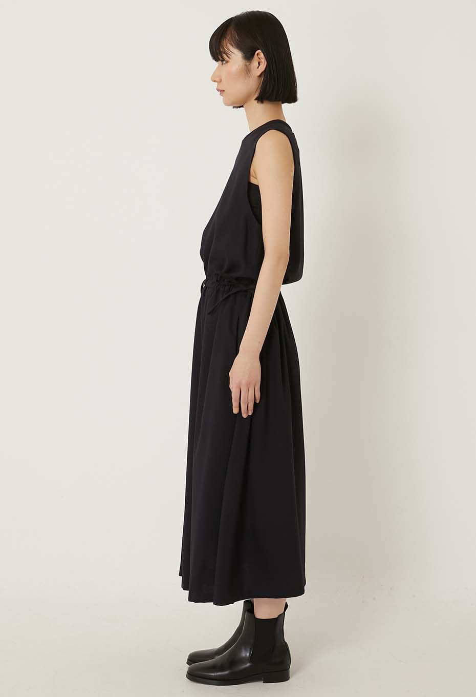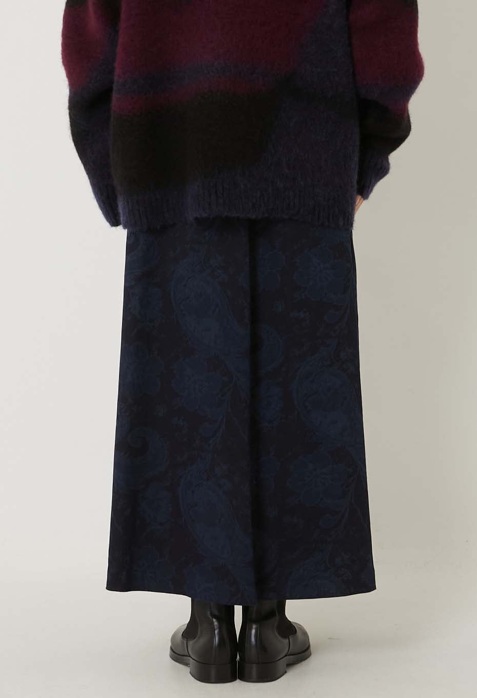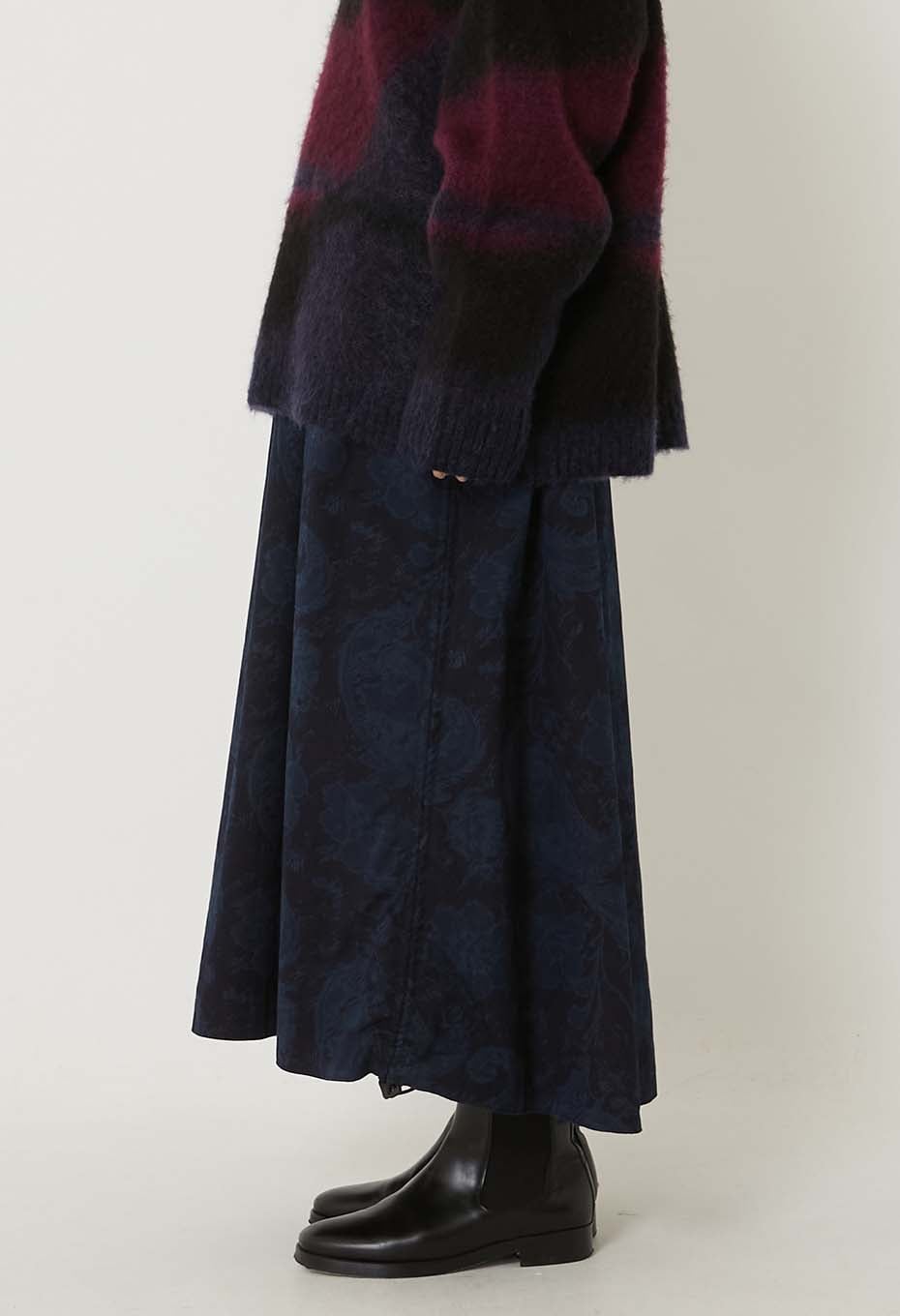 Inspired by the season's theme, "Tsujigahana," the pattern is created using bleach. bleach, which creates gradation of colour intensity, creates a depth reminiscent of an antique-style pattern. The drawstring elastic on the side line allows you to adjust the hemline, adding variety to your look. This is a simple yet striking gathered skirt that makes the most of the texture Material and the bold pattern.