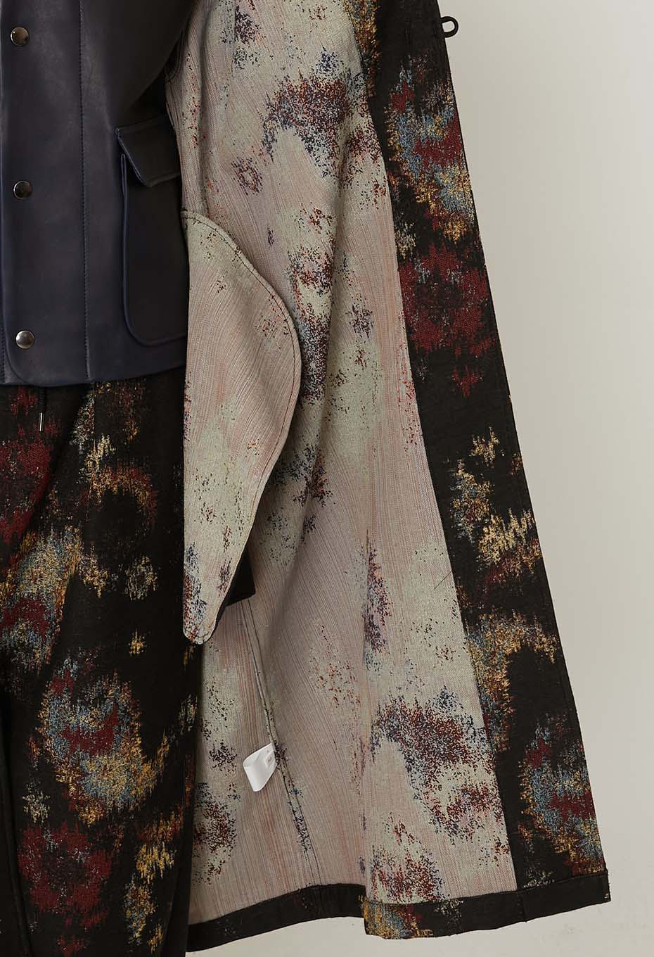 This collarless, long haori-style jacket has a casual, open front. The Gobelin weave feels natural to the touch and can create highly artistic and intricate patterns by regularly alternating the warp and weft yarns. This unique weave pattern and the soft, thick texture of this material give it a heavy appearance, much like a rug or a painting.This long haori-style jacket has a compact back-neck width at the top and straight lines on the front that allow it to be worn casually, reminiscent of kimono styling. This jacket has a straight silhouette with slightly dropped shoulders and is designed to be worn smoothly like a long cardigan.