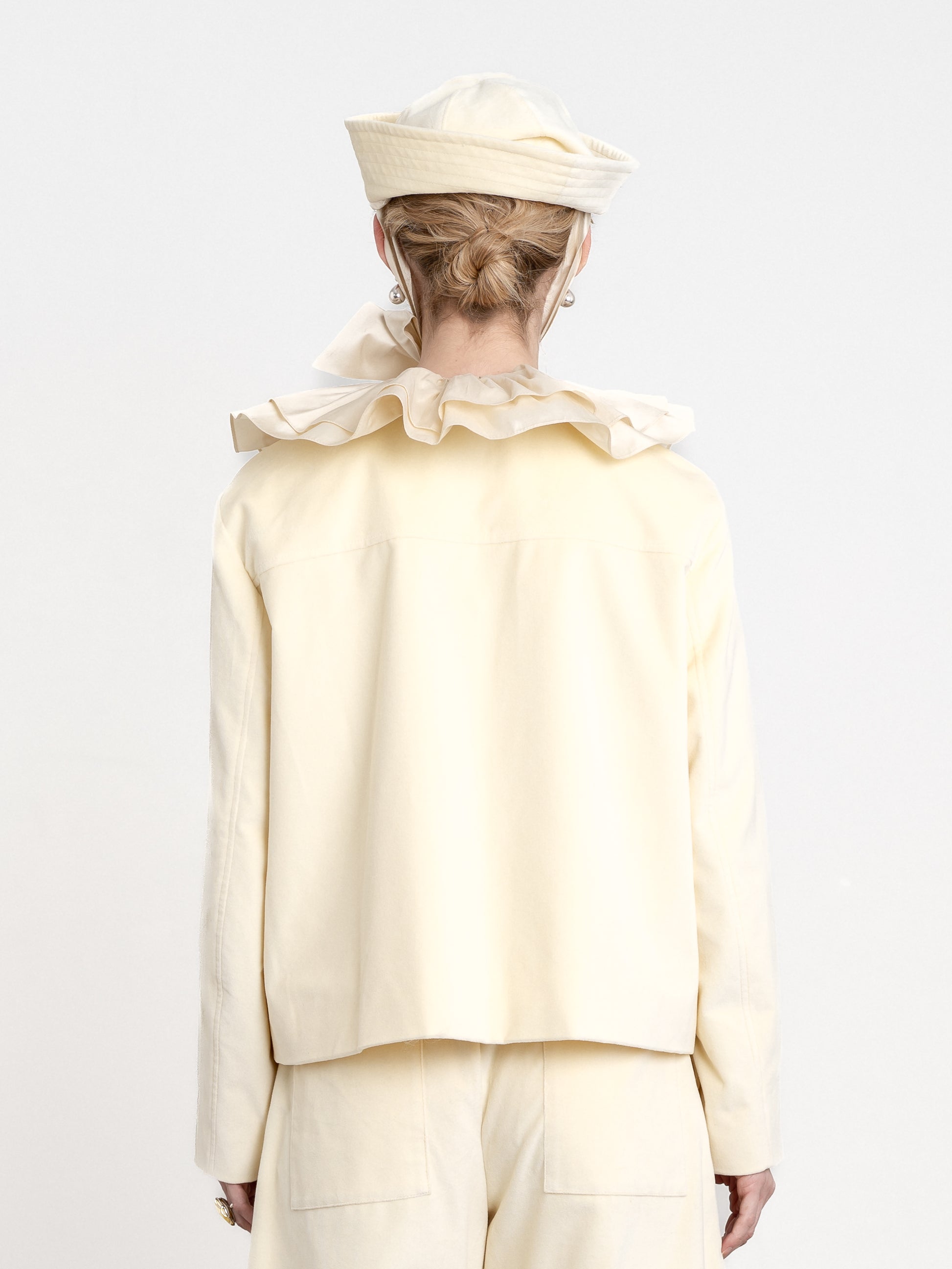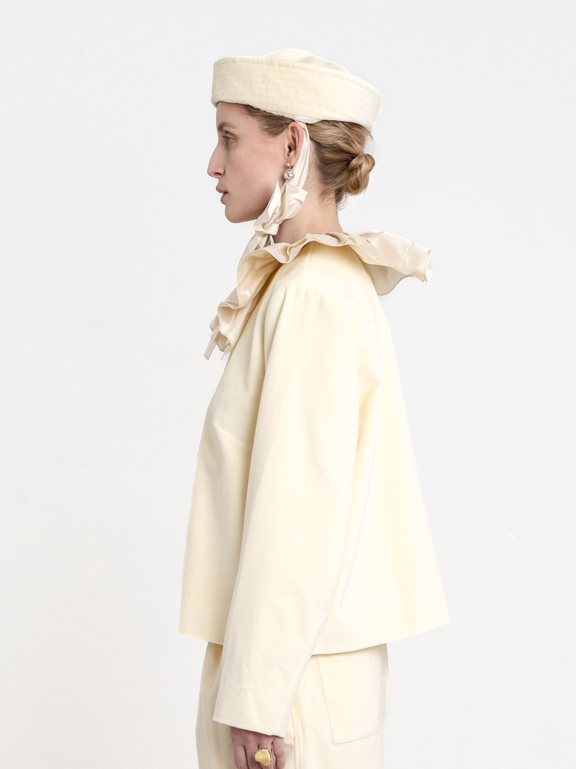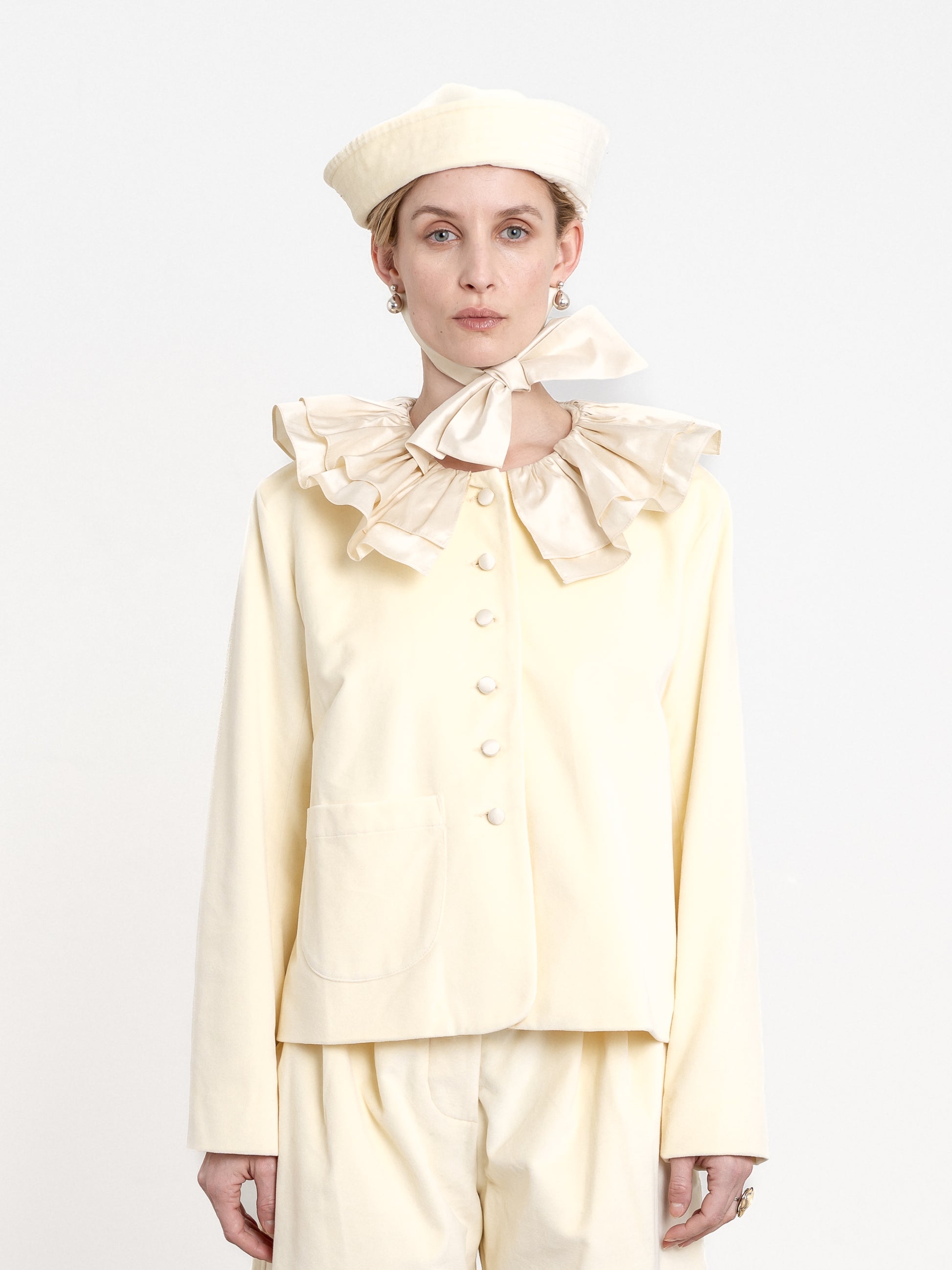 A classic sailor’s hat elevated in soft-to-the-touch British cotton velvet and a matching ivory silk tie. This is a fun accessory to brighten any ensemble – tie it in a bow, under the chin, or on top of the head and away you go!