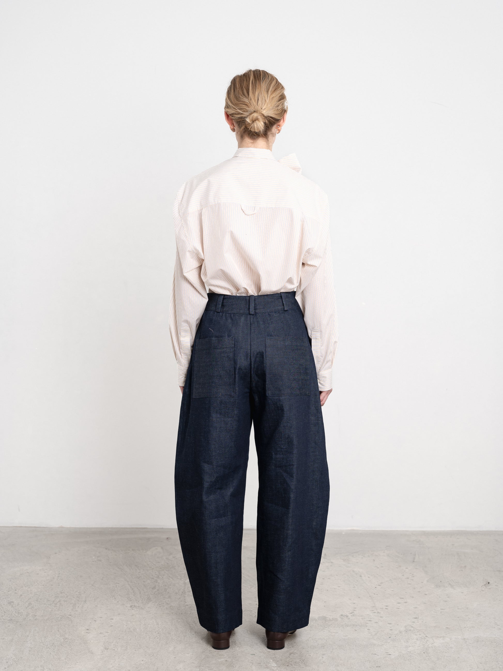 These subtle curved balloon-leg trousers are crafted from a structural Japanese denim, which helps to maintain their distinctive silhouette. Features front pleats, concealed button fly fastening, belt loops, and side seam pockets.