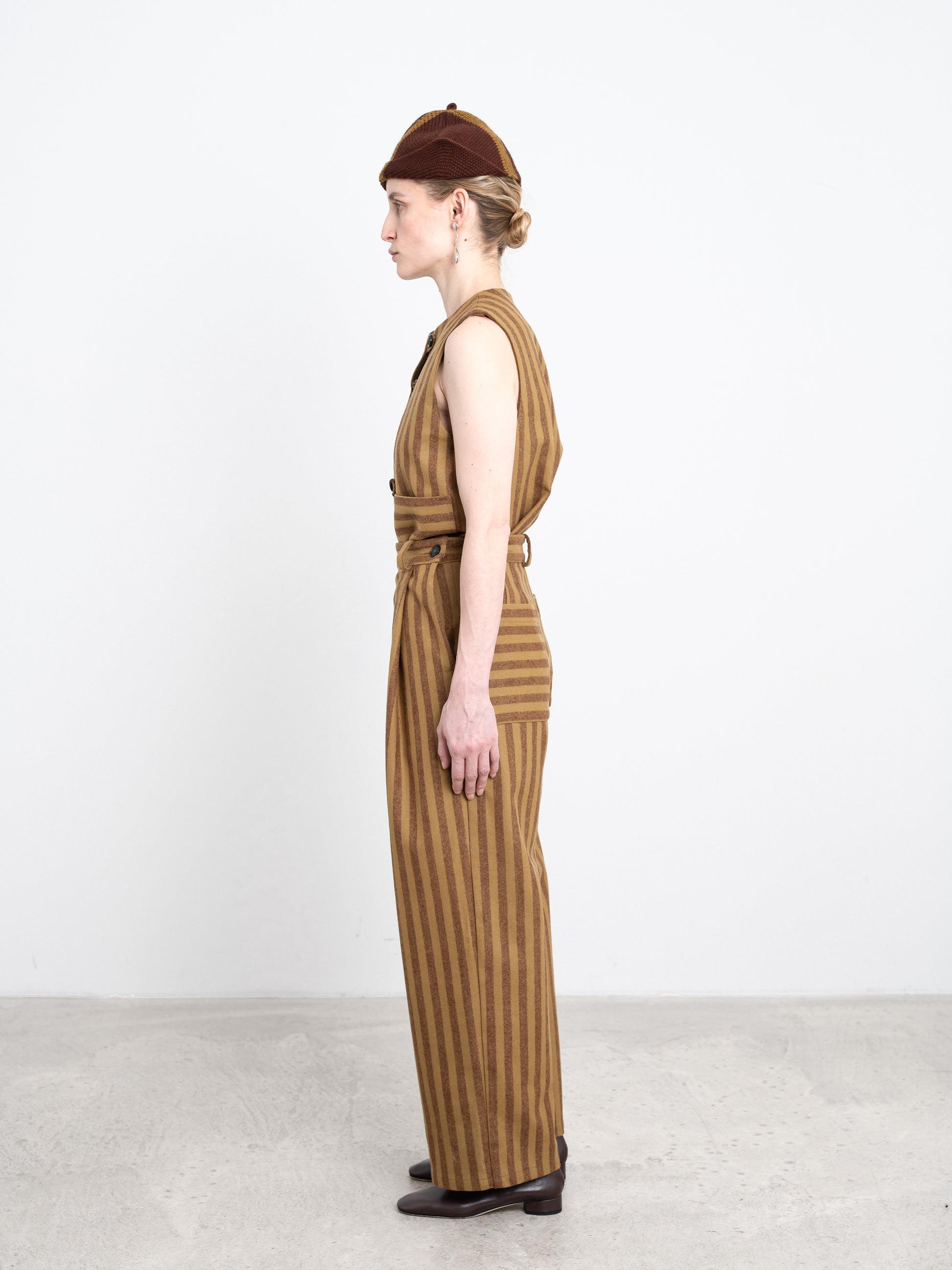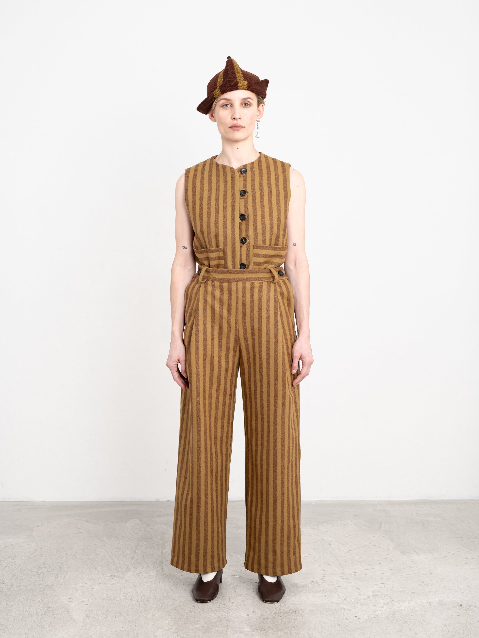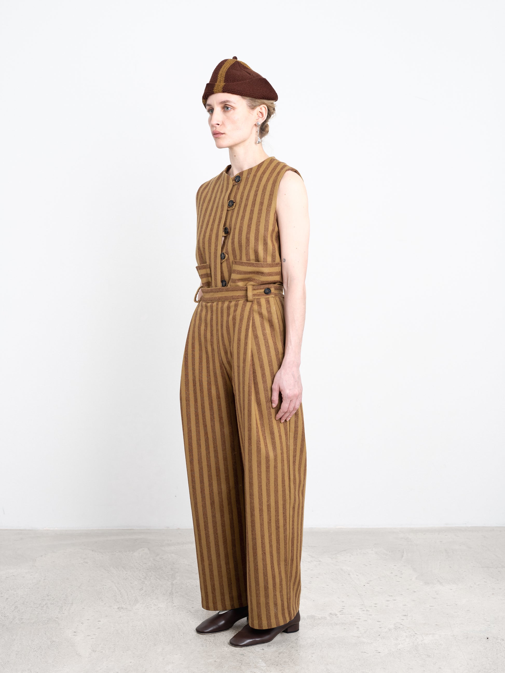 A timeless straight-leg style trouser made from heavyweight striped wool. These soft trousers feature classic details including front pleats, belt loops, and button closures at the side seams. Lined in silk-viscose for comfort.