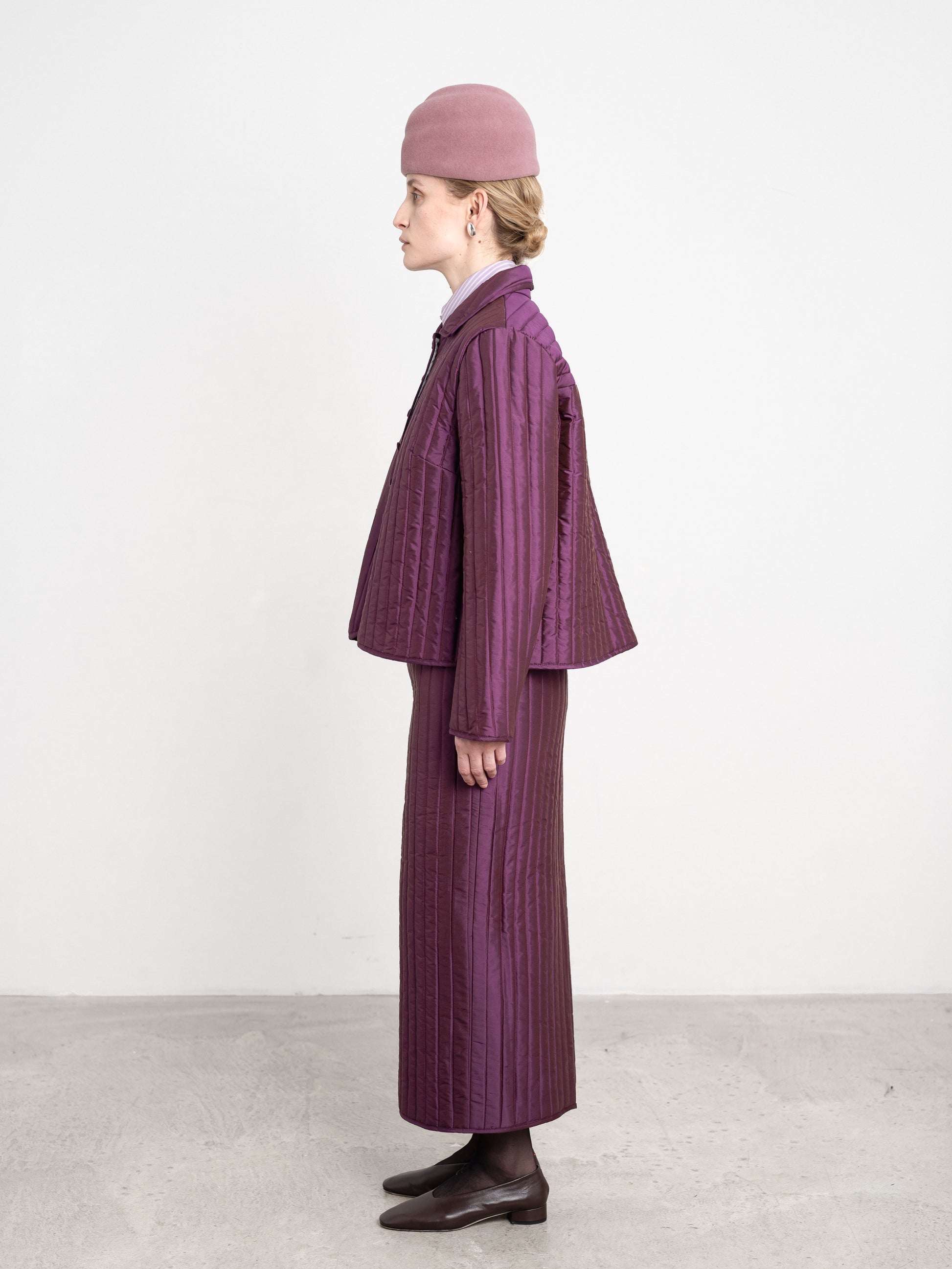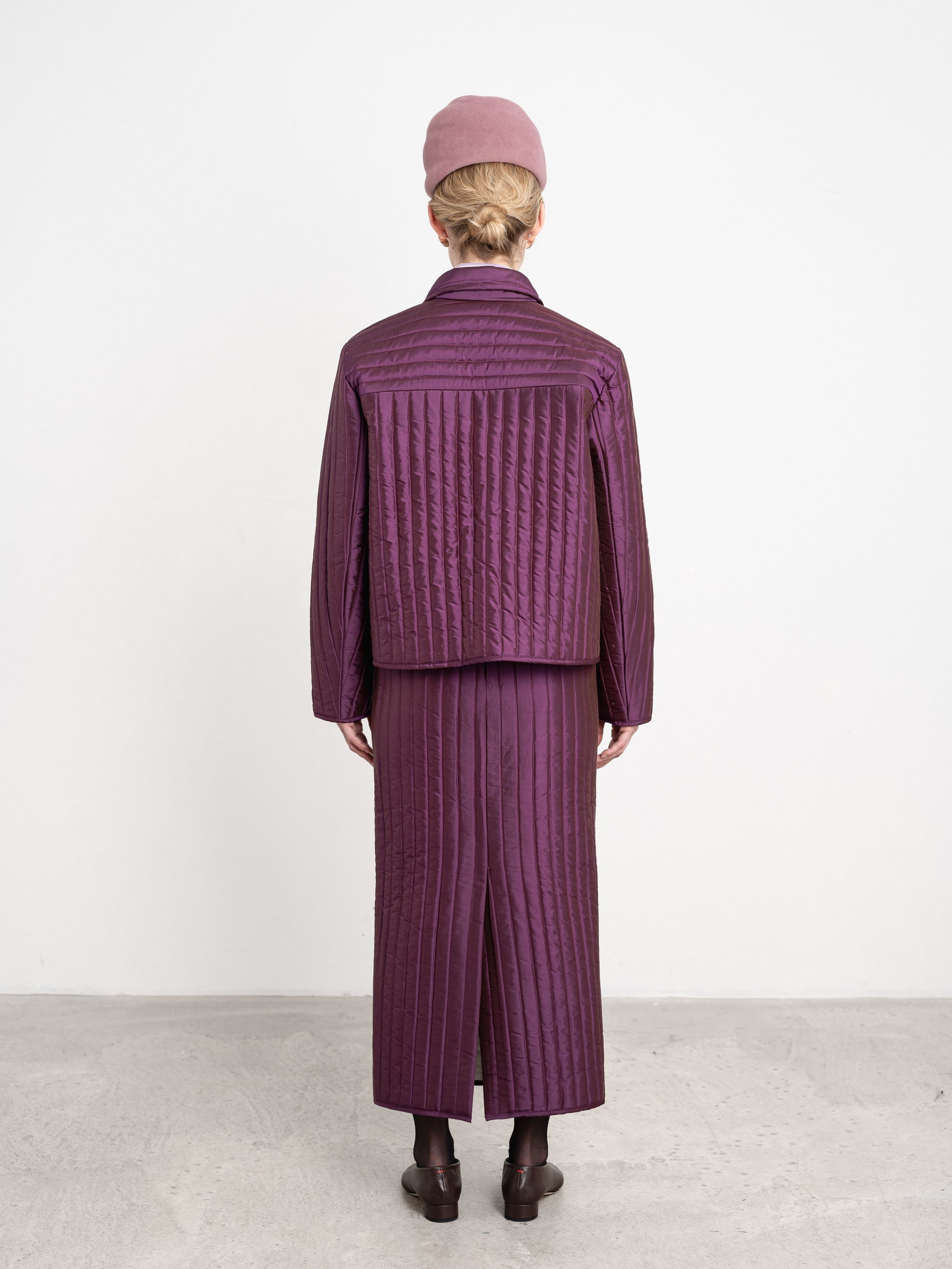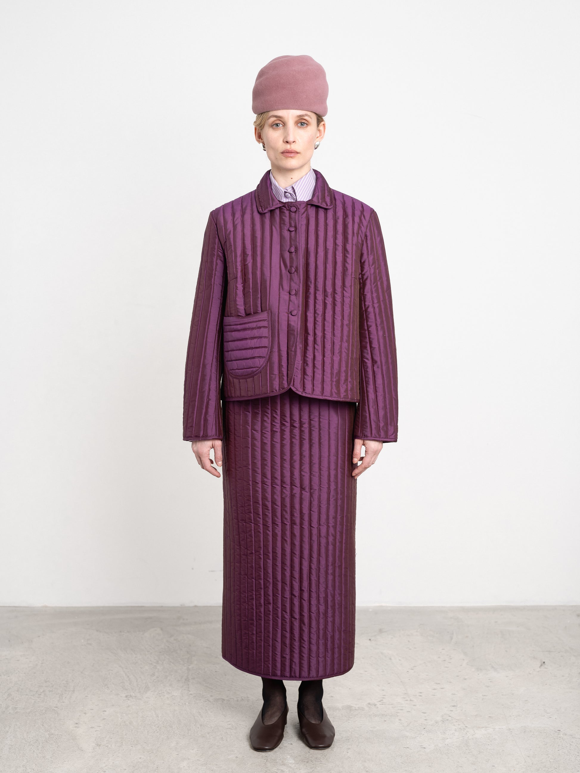 New for AW25, the classic and much-loved lillie jacket has been updated in a rich plum coloured 100% silk dupion and quilted with 100% wool wadding for additional winter warmth. this gives the fabric more weight, making it the suitable choice for lightweight outerwear. features a single front patch pocket, covered button front closure and classic pointed collar.