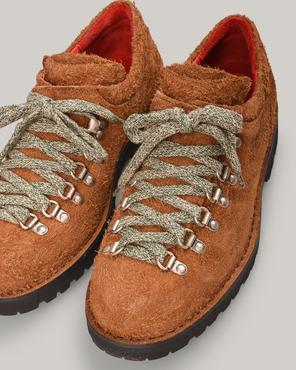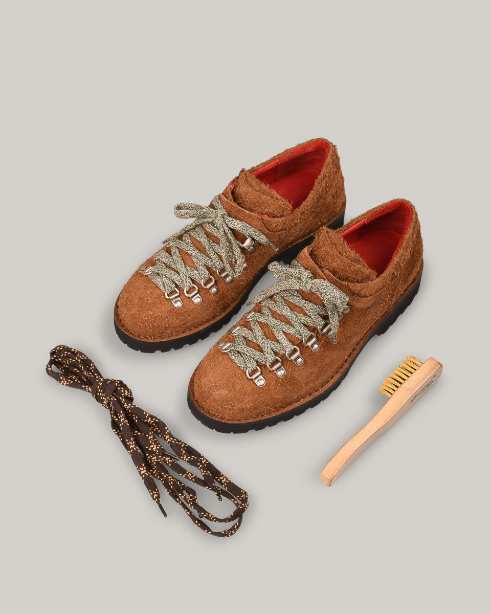 Superbly shaped hybrid between and hiking boot and shoe, this time with their new lush rough out leather. Utilising a solid black Vibram commando sole, a rust lining and inner sole, incorporating our shop colours. Antique silver 'D' ring eyelets grace the top, with a speed hook to boot, plus beige & brown flat laces to fasten. Gorgeous. Spare pair of brown & orange flat laces in case you want to swap out. Metal wire brush to restore the nap.