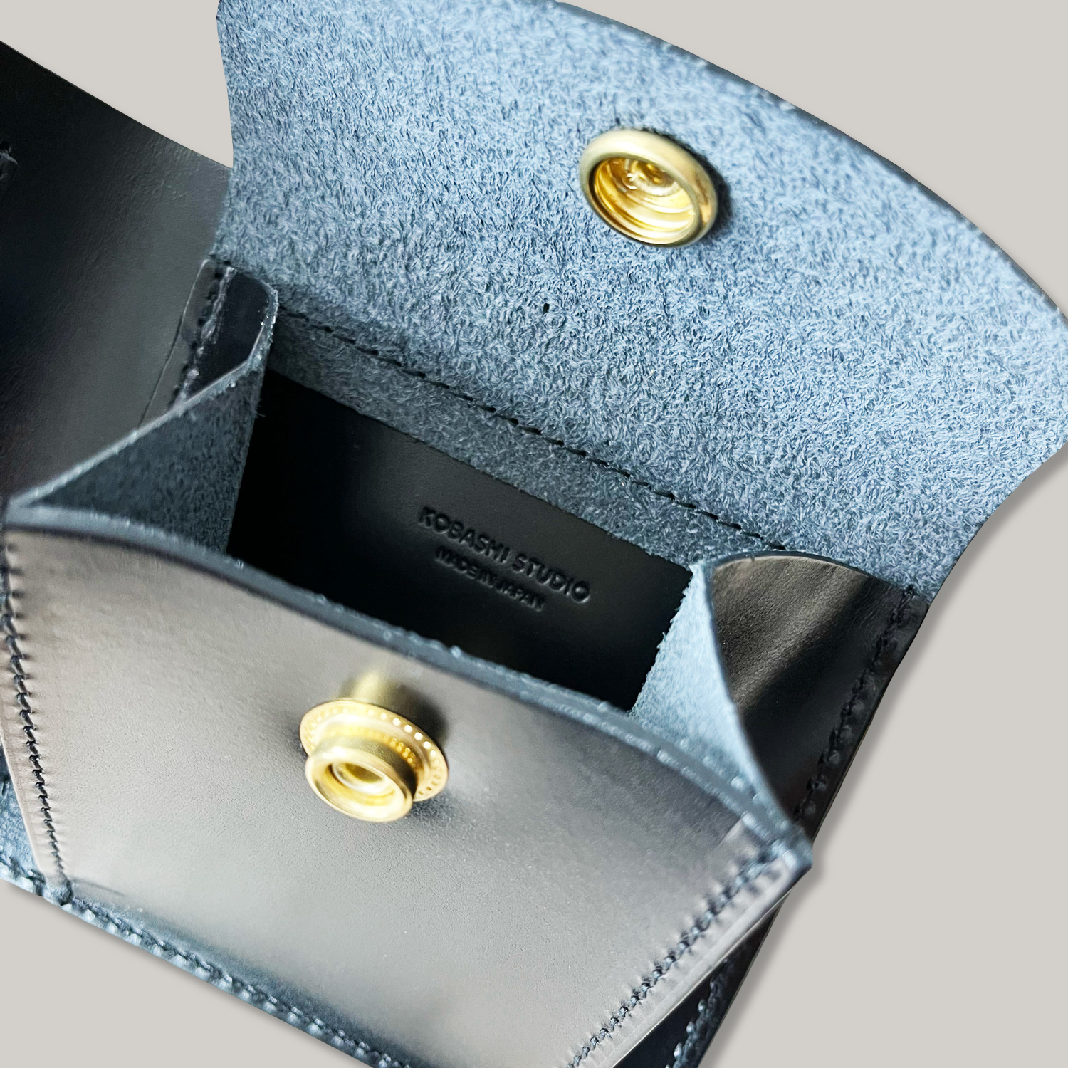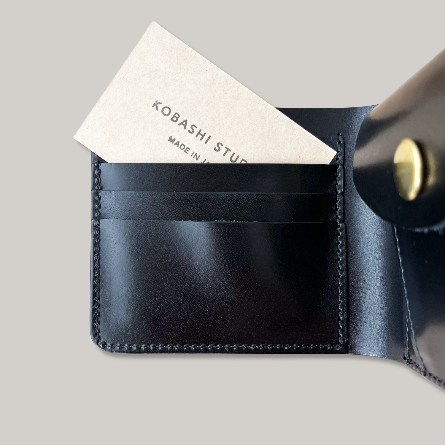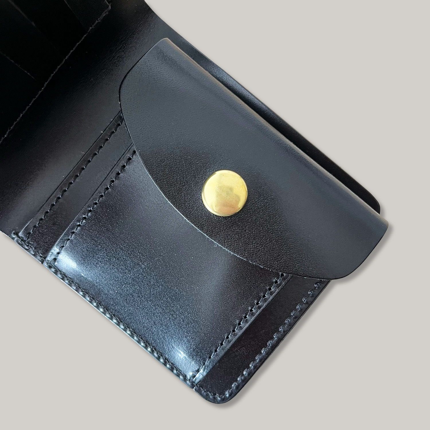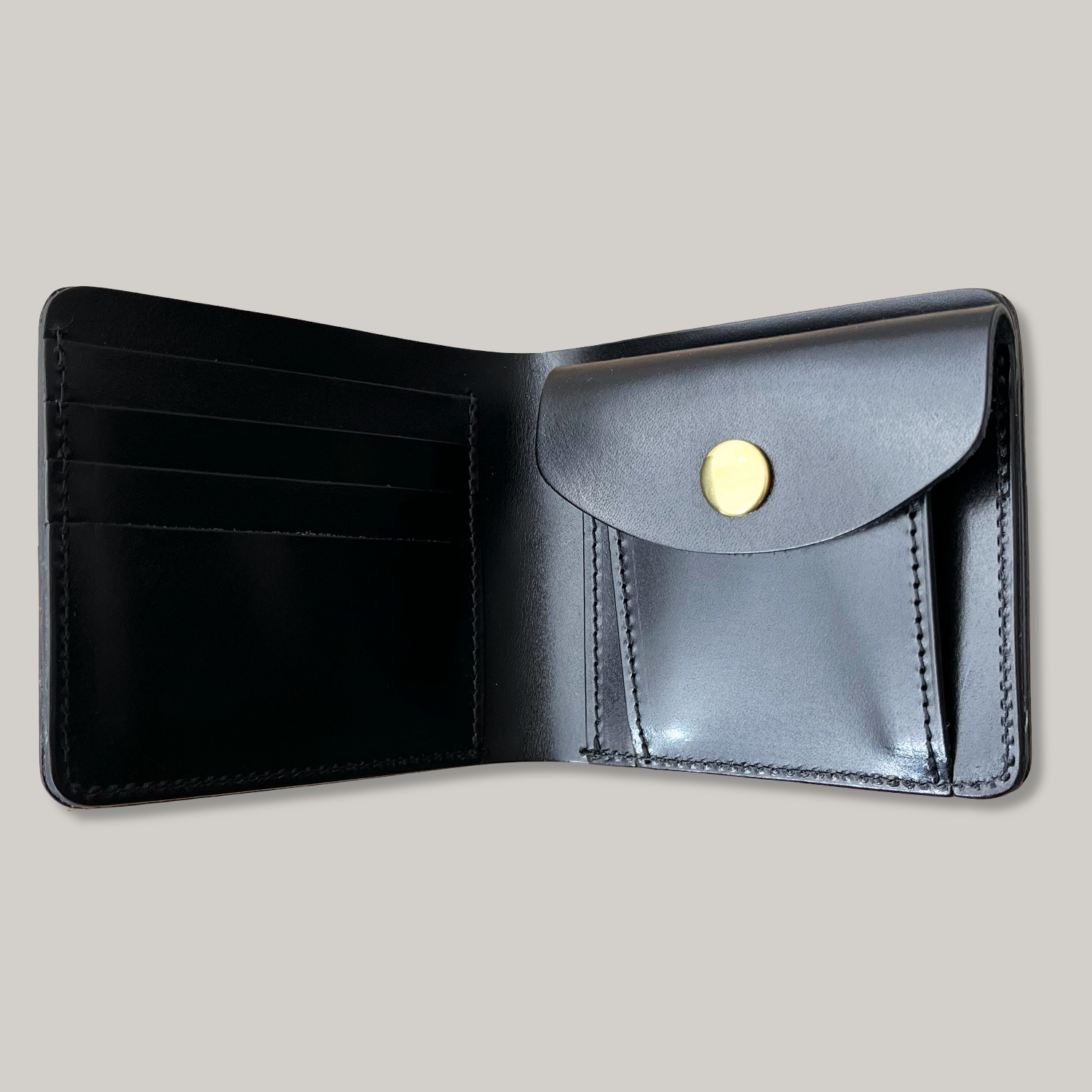 Bill fold wallet. Main bill pocket, four card slots and coin pocket with made-in-Japan brass button.