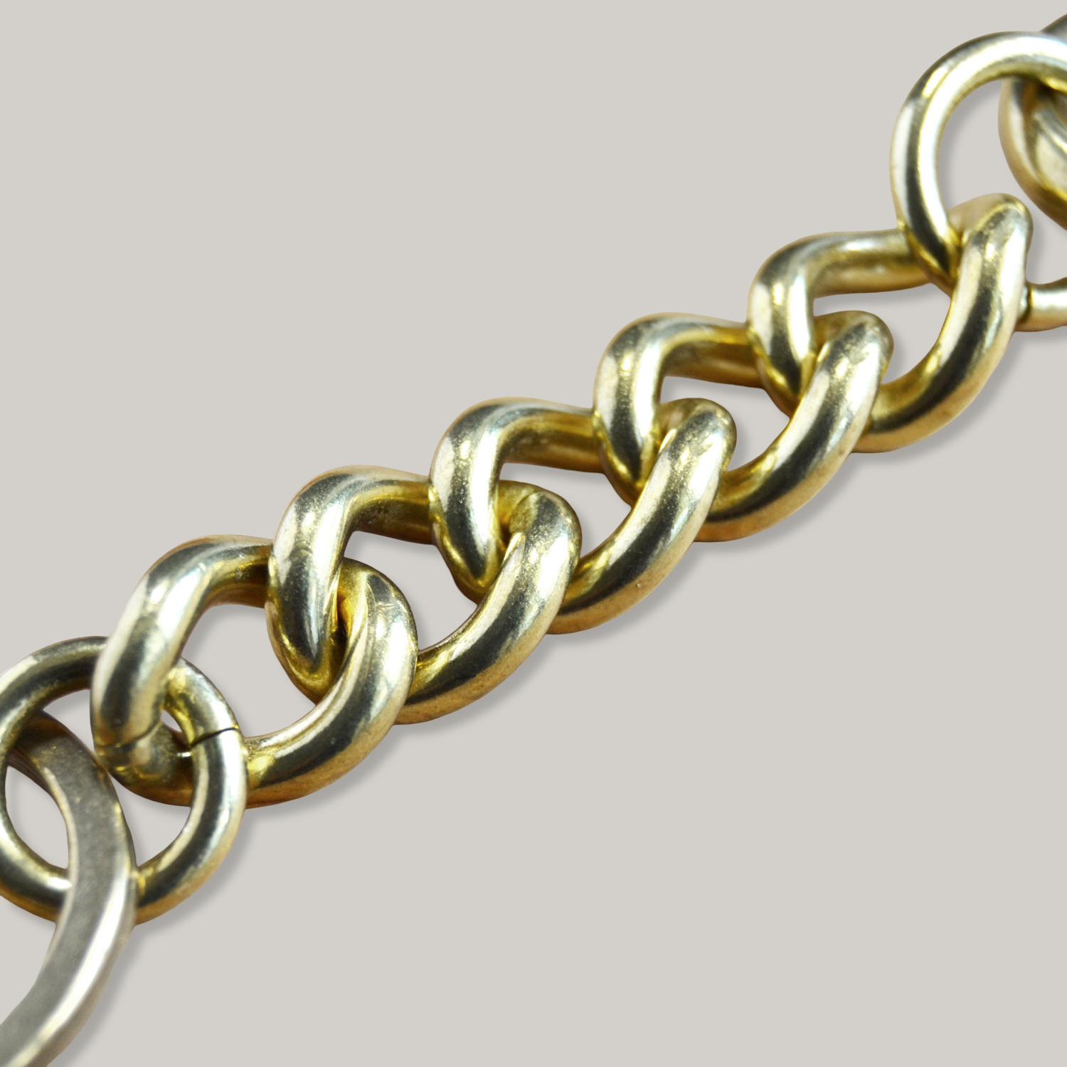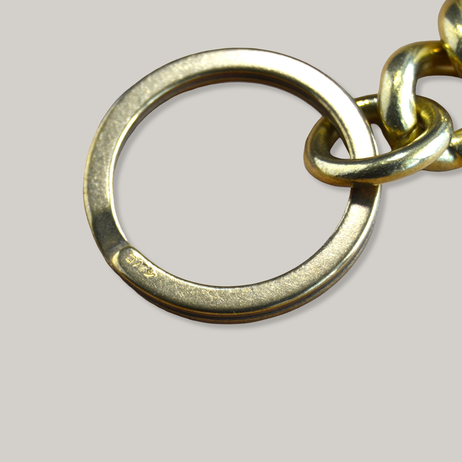 Sand-cast figure-8 snap and heavy twist plain chain and a flat double ring. The 4 mm new twist chain is made by a metal parts manufacturer established in 1930. Only the spring lever is made of steel and plated in solid brass colour. 100% Japanese solid brass.