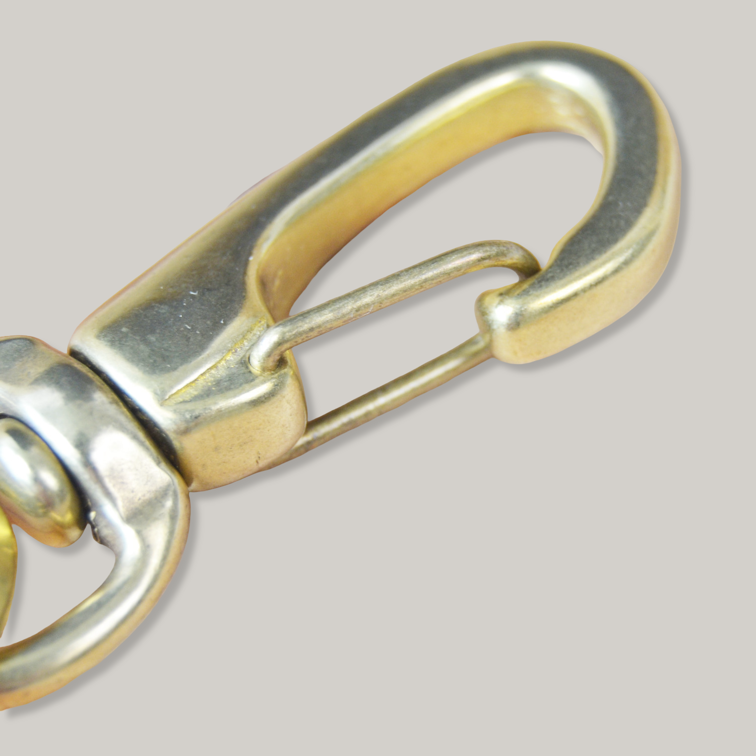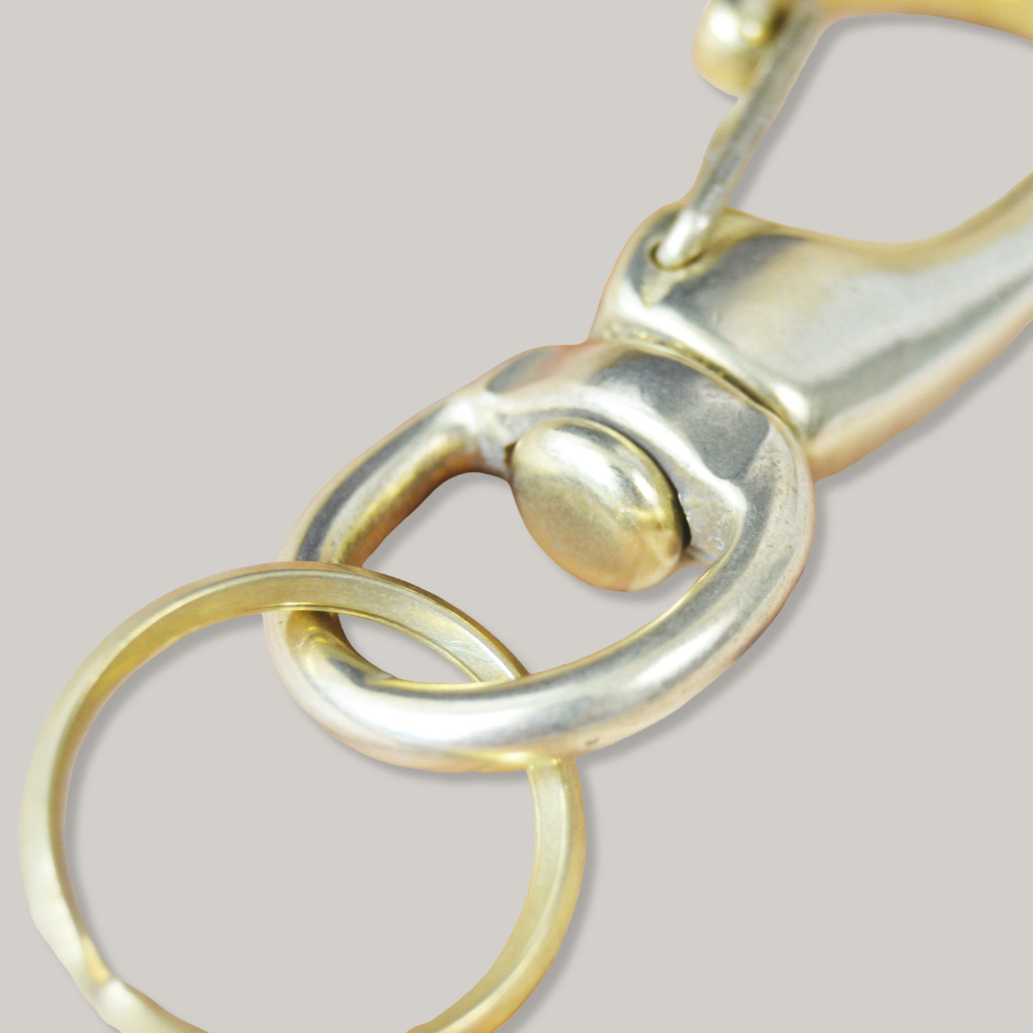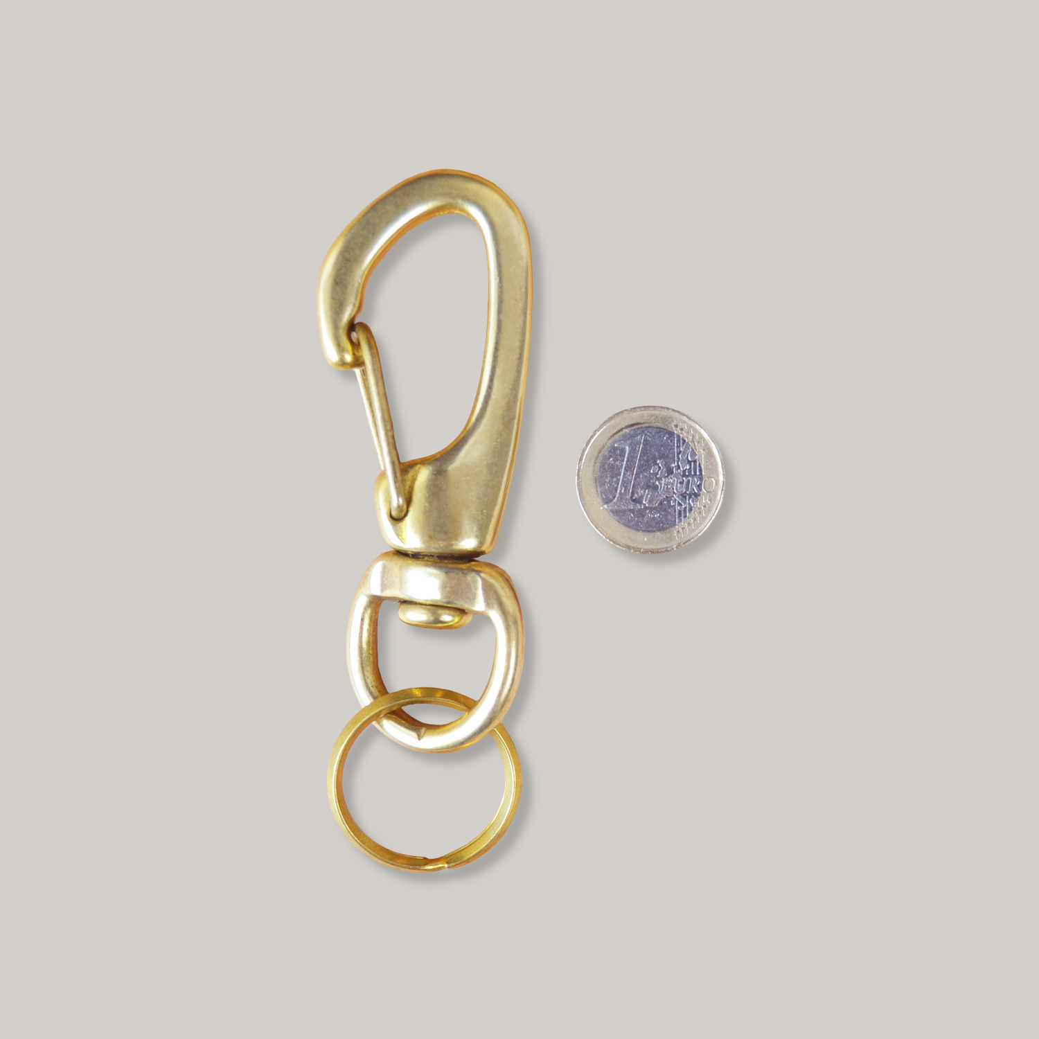 Large and heavy solid brass key snap with double ring. A rotating can prevents the key bundle from twisting. Handmade sand casted snap parts are individually assembled by foot in an old press at a family operated foundry established in 1958. Only the spring lever is made of steel and plated in solid brass colour.