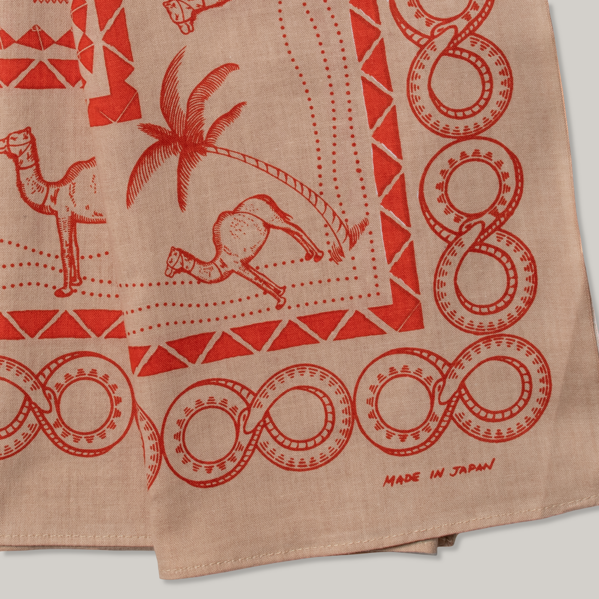 Sphinx is a design based on rodeo bandannas and modern bandannas. We have created a sort of fast colour hybrid design. Drawn by Satoshi Kaga, the author of the camel brand sticker, this design is both full of depth and however quite simple. A train of camels being led through the desert dunes, surrounded by a border of broken pyramids. On the outside edge, protecting the entire design is the uroboros. The symbol of life consuming life. While in the centre we have the sphinx in riddle form. Once again reflecting life and Mysterium tremendum. Plenty of classic symbolism and witty conjecture for people to ponder over. It also happens to look really cool with a big pyramid smack dab in the middle.