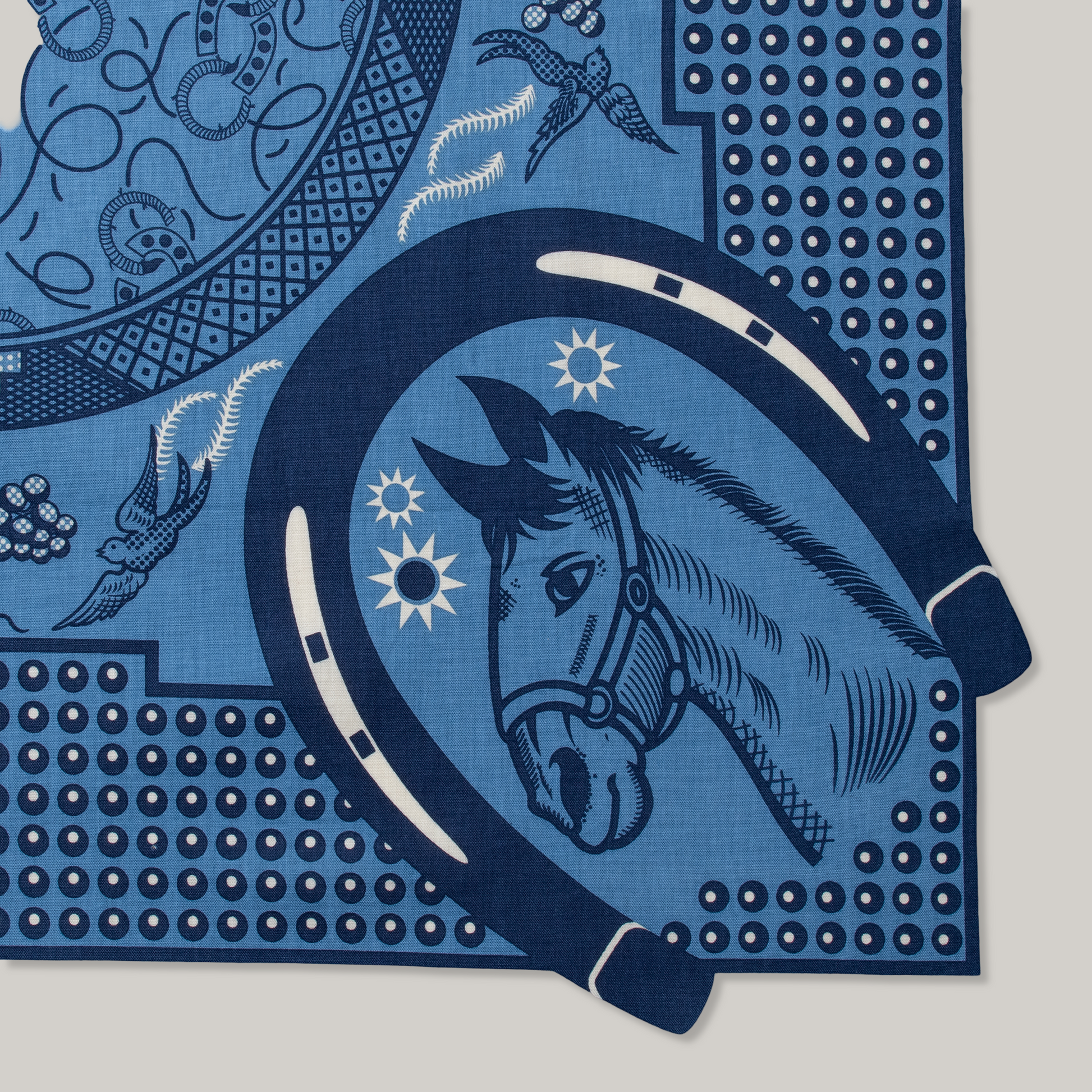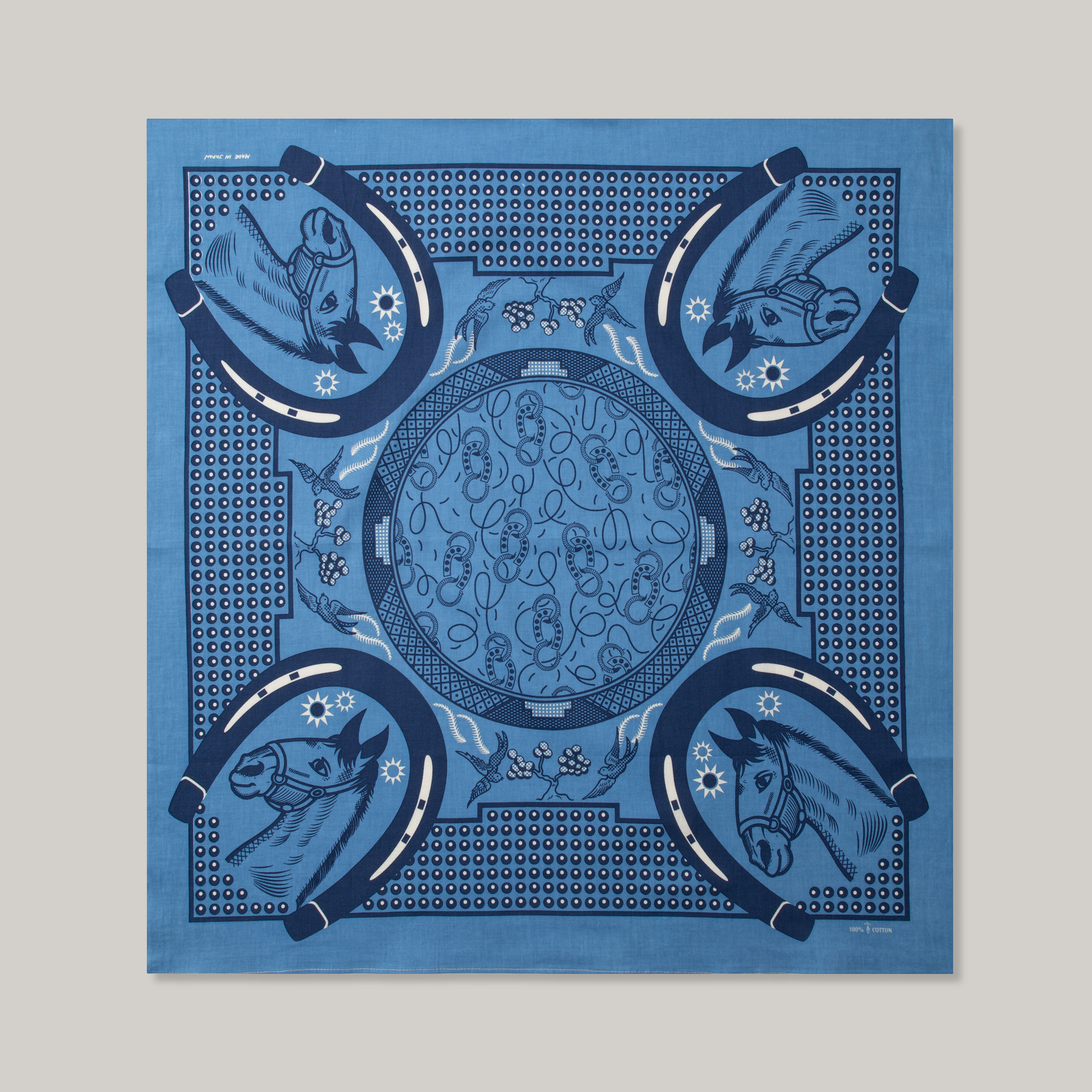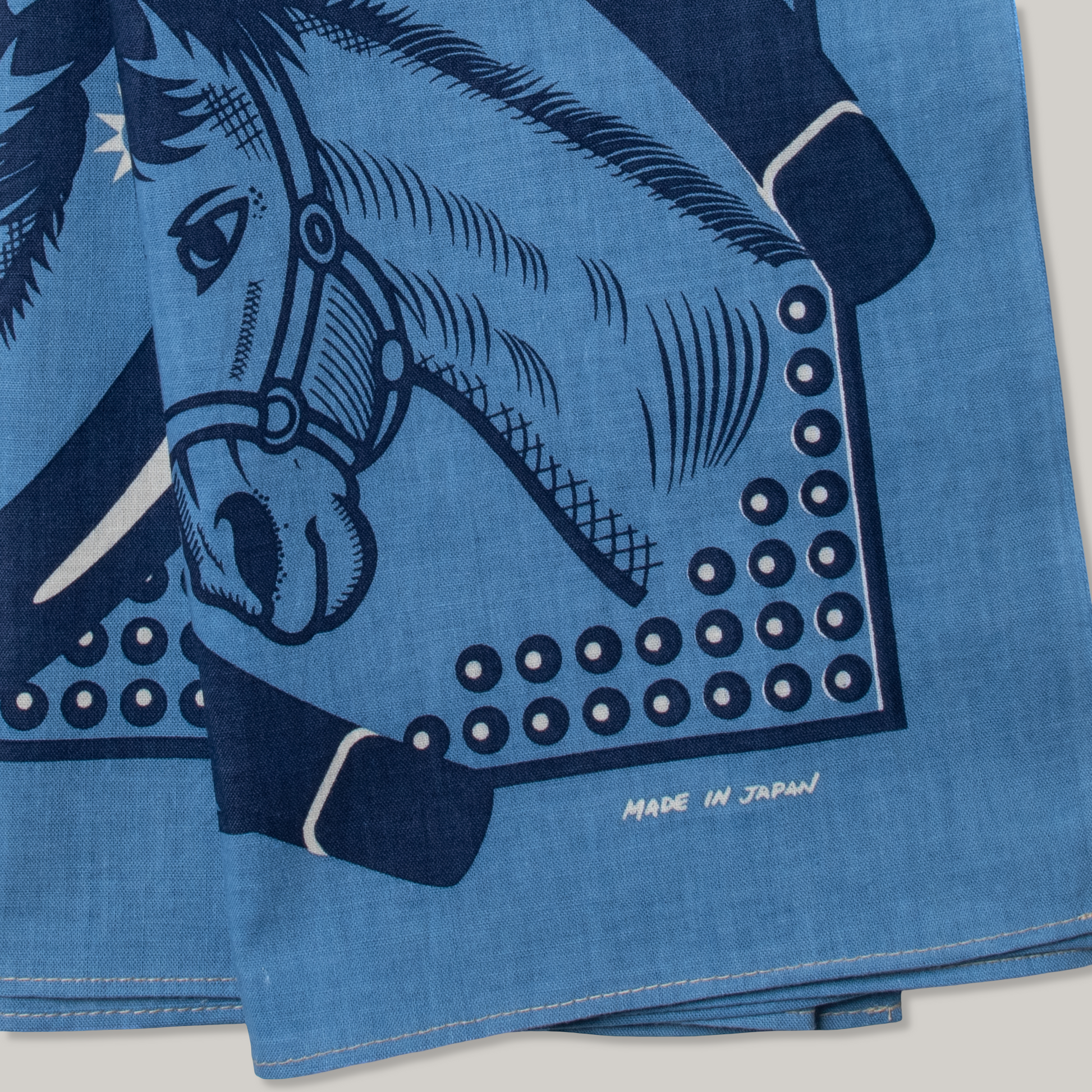 Uma is a design Satoshi Kaga and Jonathan have been working on for several months. Inspired by a friend Stable West to make an equestrian themed bandanna. The main idea was to create a design that was based on blue and white ceramics. Being a fan and collector of these items it was only natural for them to use similar details and themes. They have included a little bit of East and West here. Notice the Japanese horse shoes mixed with Western horse shoes. The darker shade here will actually be dark indigo and the light a Parisian blue. With little details of ecru to balance it out. This design will also be included in their standard collection so expect to see many colour renditions of this design.