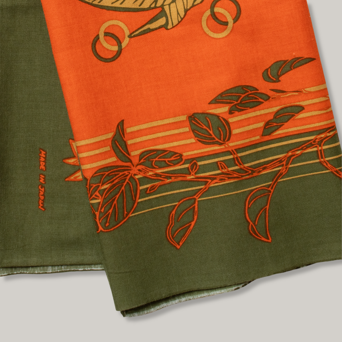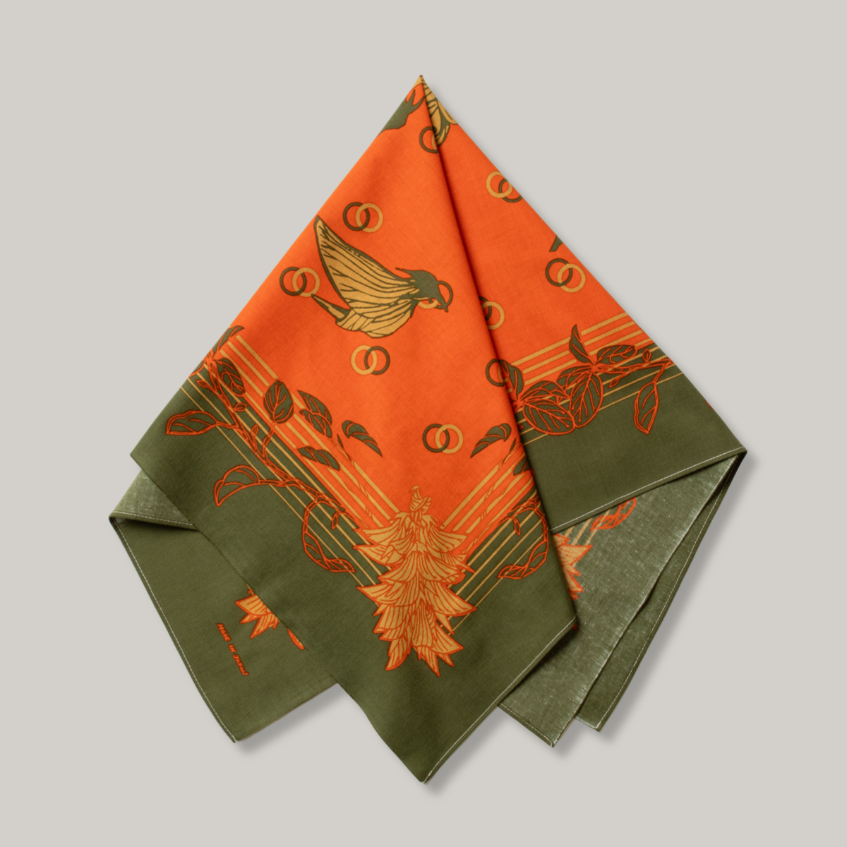 This curious design is based upon the meme-able plant Crotalaria cunninghamii. Also known by the common name of parrot pea, green bird flower etc etc etc. It is native to Australia and blooms the green flowers from January to April. It is a plant that has had some interesting attention on social media lately. Due to its resemblance to a bird, most people think this is a miracle. To a botanist however, this is a pretty normal Fabaceae flower/fruit structure. It is an interesting and beautiful plant. Starting with a mutual fondness for bandannas and plants, Jonathan used our store’s colour scheme as the palette and their location as the design inspiration. Crotalaria flowers and leaves, with symbolic rings of collaboration and commitment. Funky, cool green and orange colour scheme that works all year everyday. We hope all our customers will enjoy this design and its unique Aussie twist on the bandanna.