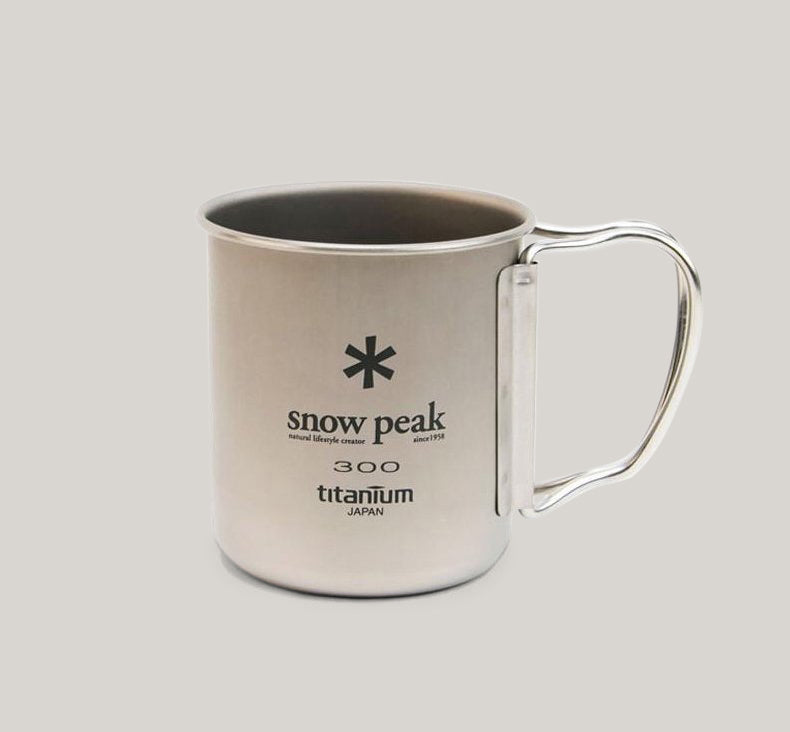 Snow Peaks ultralight single-wall titanium cups can be used directly over a flame, and feature folding handles for easy packing.