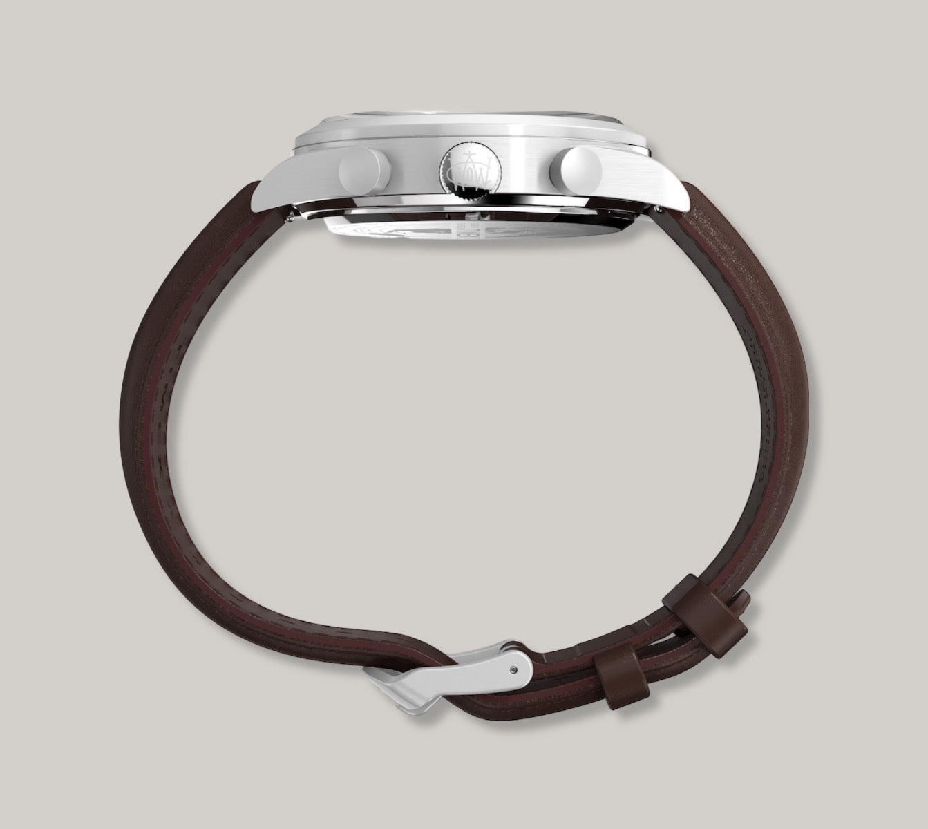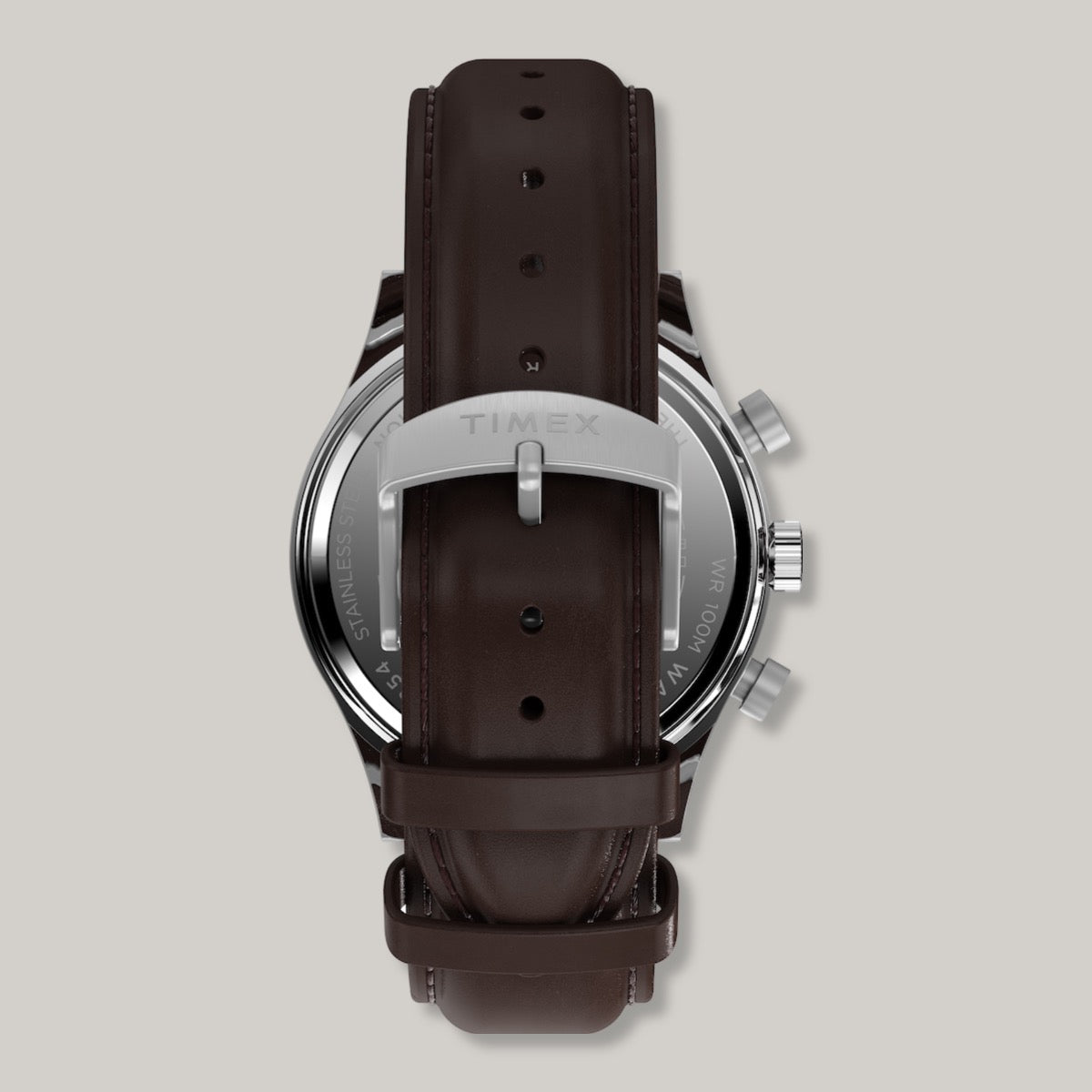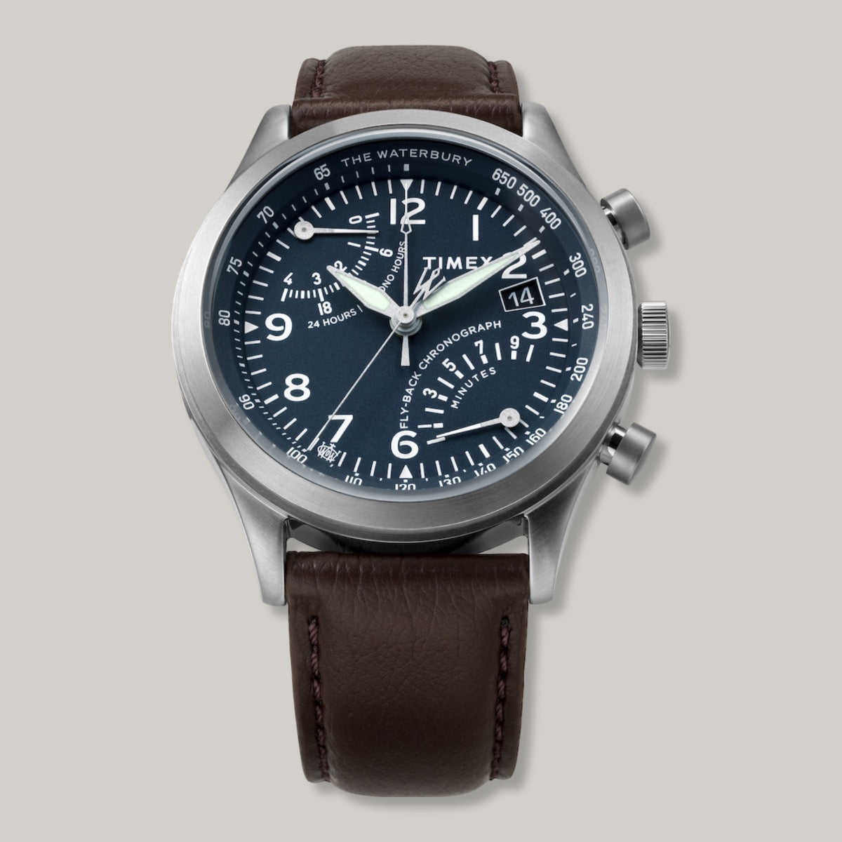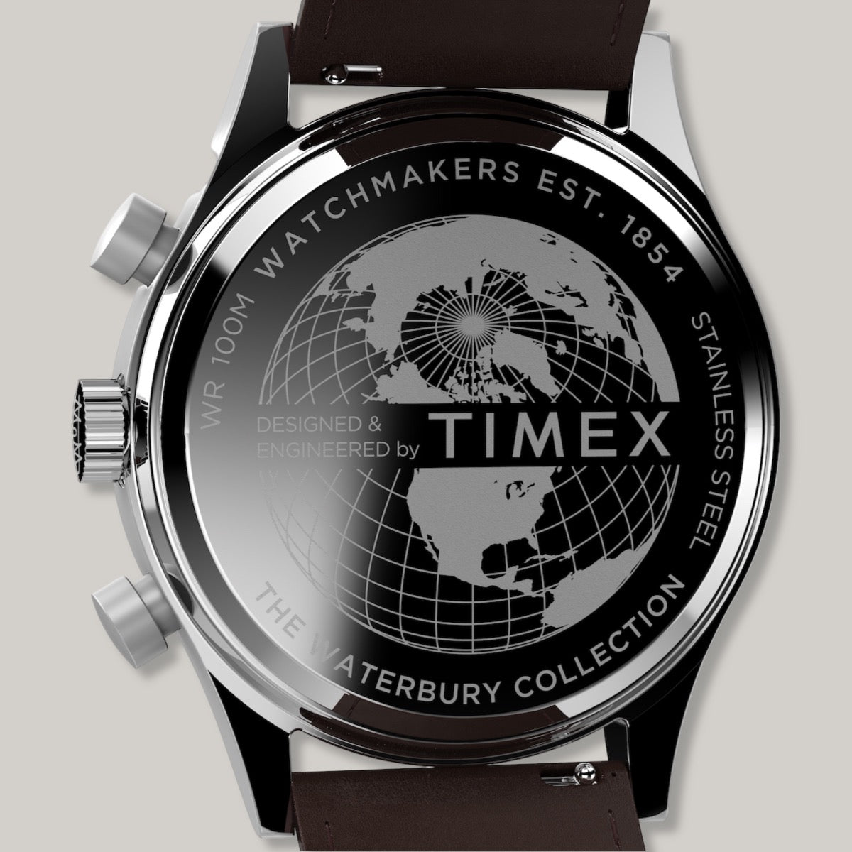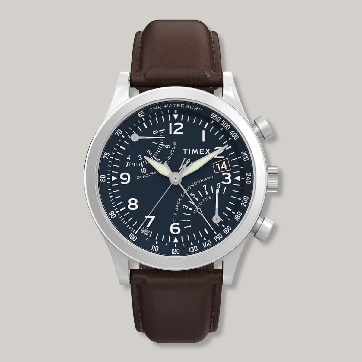 Built with Timex proprietary flyback chronograph movement designed in Pforzheim, Germany, the dial of the Waterbury Traditional Flyback Chronograph houses fan-shaped sub-dials at the 4 o'clock and 10 o'clock positions with retrograde hands. A single press of the flyback pusher instantly resets the chronograph to display the current time in the current lap without the need to stop and reset, and when the chronograph isn’t in use, the upper sub-dial doubles as a second time zone indicator. This watch boasts a robust 43mm stainless-steel case paired with a cruelty-free vegan leather strap. Other notable details include a date window positioned at 2:30, luminous hour and minute hands for enhanced visibility, 100m of water resistance, and the iconic stylized W of the Waterbury Watch Company logo displayed on the crown, sweep second hand, and beside the 7th hour marker.